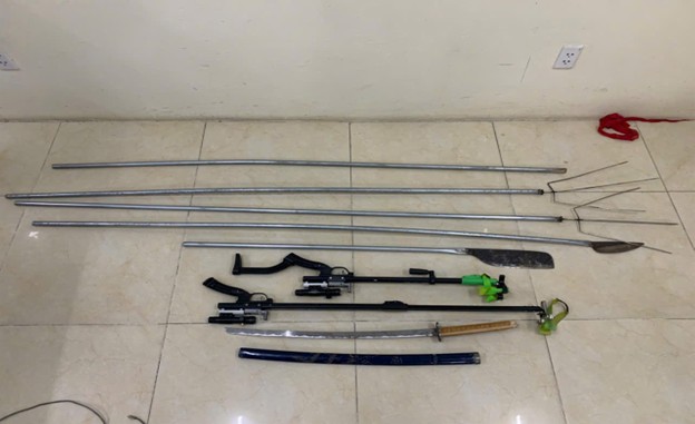 Tại cơ quan Công an, các đối tượng đã khai nhận toàn bộ hành vi vi phạm. Các tang vật đã được thu giữ gồm: Toàn bộ phương tiện là xe mô tô và hung khí của các đối tượng gồm: 01 kiếm, 02 súng tự chế bắn bi, 01 tuýp sắt gắn dao, 01 tuýp sắt phóng lợn cán dài khoảng 2m và 02 cây đinh ba.