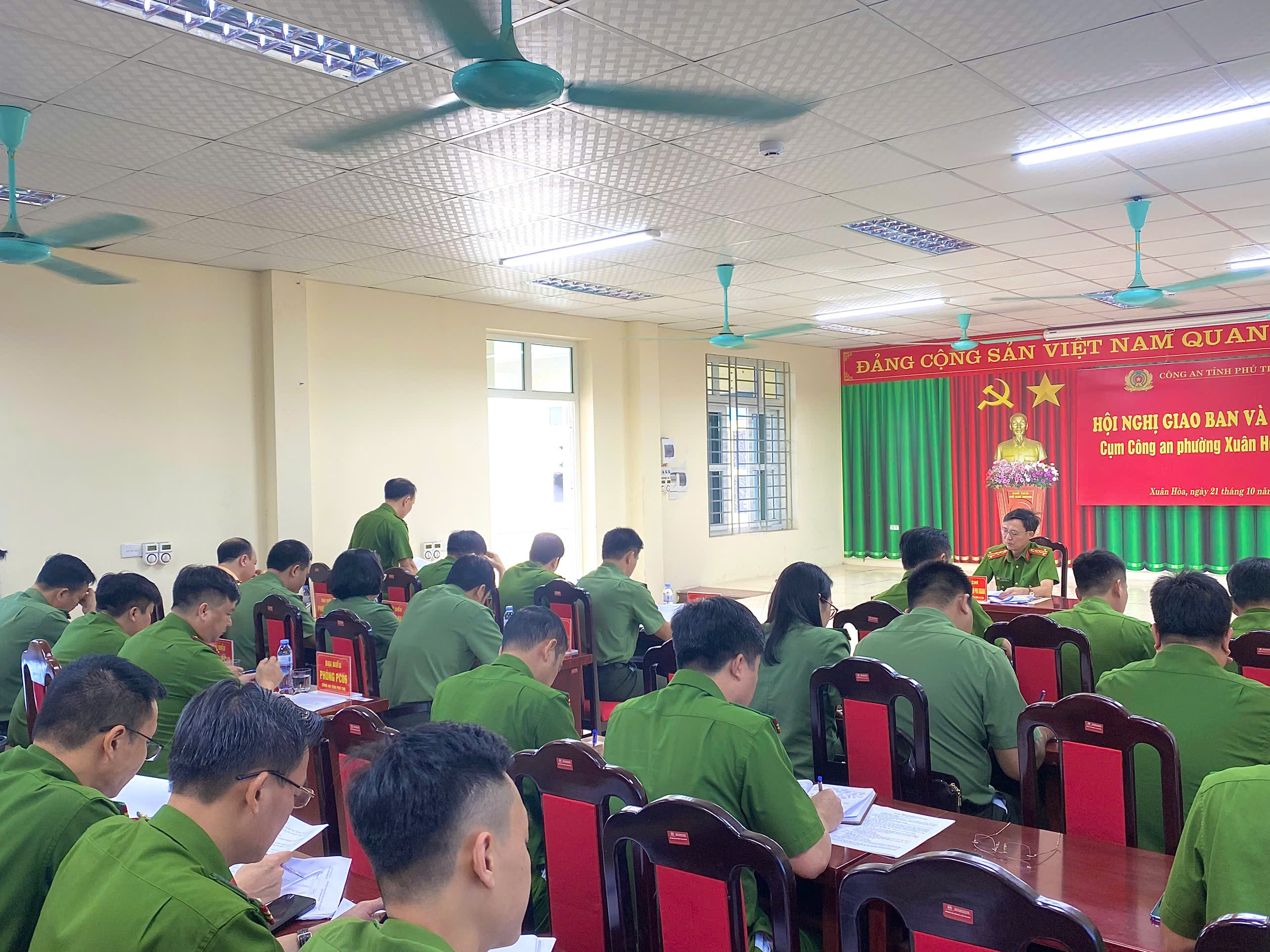 Ngày 21/10/2025, tại trụ sở Công an phường Xuân Hòa, Công an tỉnh Phú Thọ tổ chức Hội nghị giao ban tháng 10/2025 và đối thoại cụm Công an 02 phường Xuân Hòa, Phúc Yên. Đồng chí Đại tá Hoàng Nguyễn Phi Khanh - Ủy viên Ban Thường vụ Đảng ủy, Phó Giám đốc Công an tỉnh Phú Thọ chủ trì hội nghị. Tham dự hội nghị có đại diện Lãnh đạo các phòng nghiệp vụ Công an tỉnh và chỉ huy, cán bộ tổng hợp Công an 02 phường trong cụm.