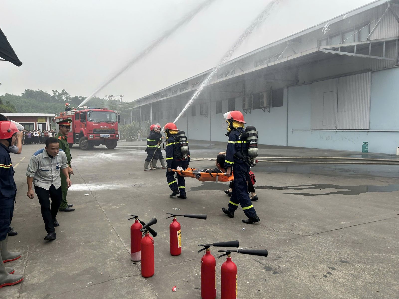 Điểm nhấn của chương trình là nội dung thực tập phương án chữa cháy, cứu nạn, cứu hộ với tình huống giả định xảy ra cháy tại khu vực sản xuất của doanh nghiệp. Khi phát hiện sự cố, lực lượng PCCC cơ sở đã nhanh chóng phát tín hiệu báo động, cắt điện khu vực cháy, triển khai các phương tiện chữa cháy ban đầu để khống chế đám cháy, đồng thời tổ chức hướng dẫn thoát nạn, cứu người bị mắc kẹt và di chuyển tài sản đến nơi an toàn. Sau đó, lực lượng phối hợp với Cảnh sát PCCC&CNCH triển khai các đội hình chữa cháy, dập tắt hoàn toàn đám cháy theo đúng quy trình.