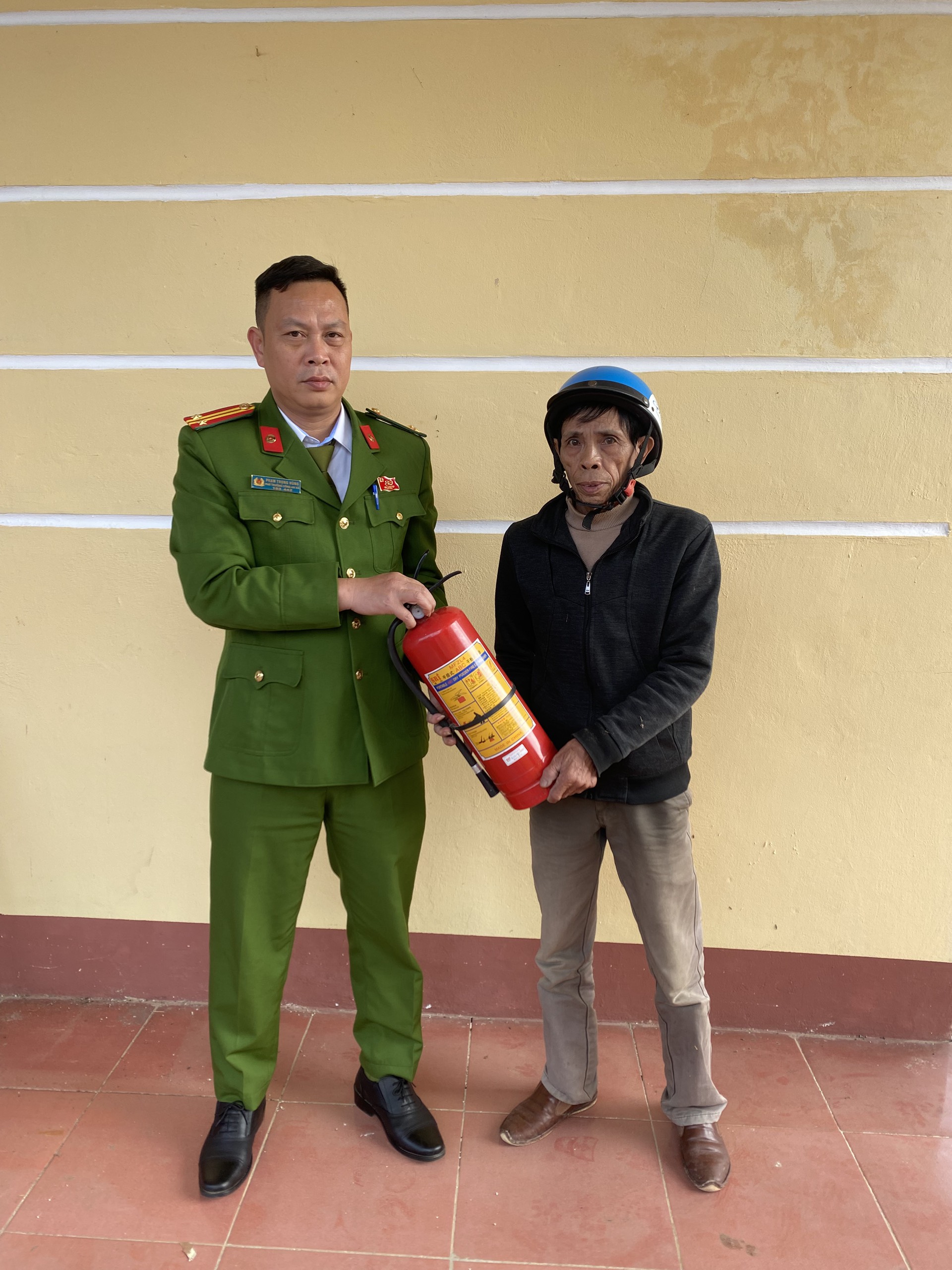 Hình ảnh người dân giao nộp vũ khí tự chế và Công an xã trao tặng bình chữa cháy Đặc biệt, Công an xã Cự Đồng đã triển khai mô hình “Tặng bình chữa cháy cho công dân tự nguyện giao nộp vũ khí, vật liệu nổ, công cụ hỗ trợ” nhằm khuyến khích người dân tham gia giao nộp, đồng thời nâng cao ý thức phòng cháy, chữa cháy tại hộ gia đình.