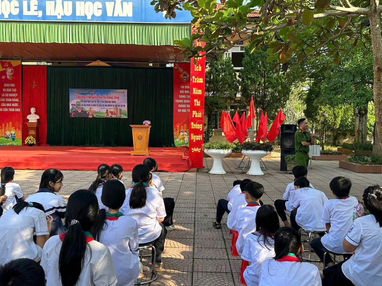 Nhằm nâng cao nhận thức cho học sinh về kỹ năng sống và các quy định pháp luật liên quan đến an toàn giao thông, phòng chống tác hại thuốc lá điện tử, bạo lực học đường và xâm hại trẻ em, Công an phường Hòa Bình đã phối hợp với Trường Tiểu học và Trung học cơ sở Trung Minh tổ chức chương trình tuyên truyền chuyên đề trong khuôn khổ kế hoạch phổ biến, giáo dục pháp luật năm 2025.