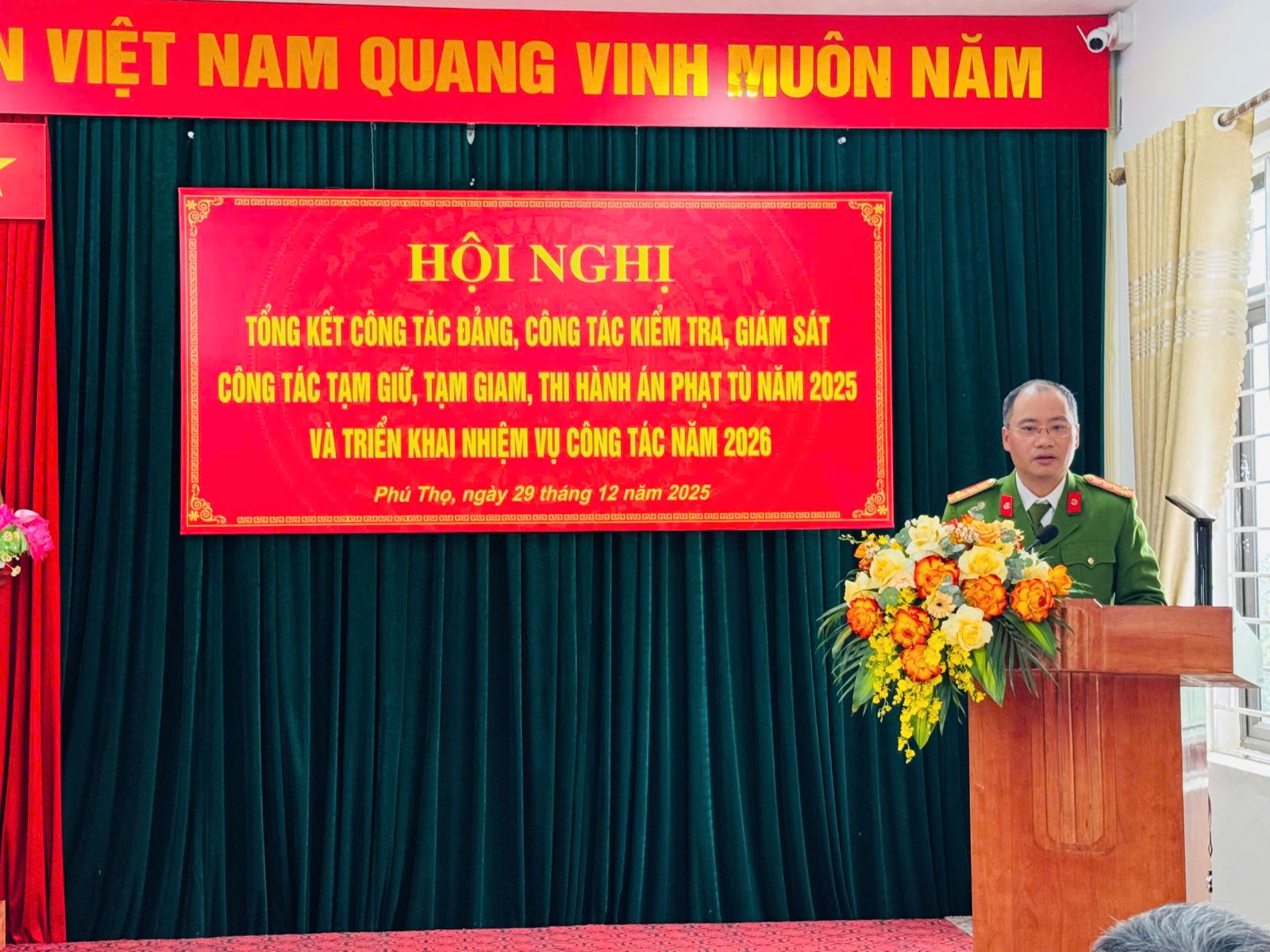 Thực hiện chương trình công tác năm 2025, vào chiều ngày 29/12/2025, Trại tạm giam số 1 - Công an tỉnh Phú Thọ đã long trọng tổ chức Hội nghị tổng kết công tác Đảng, công tác kiểm tra, giám sát, công tác giam giữ, thi hành án phạt tù năm 2025; triển khai phương hướng, nhiệm vụ công tác năm 2026.