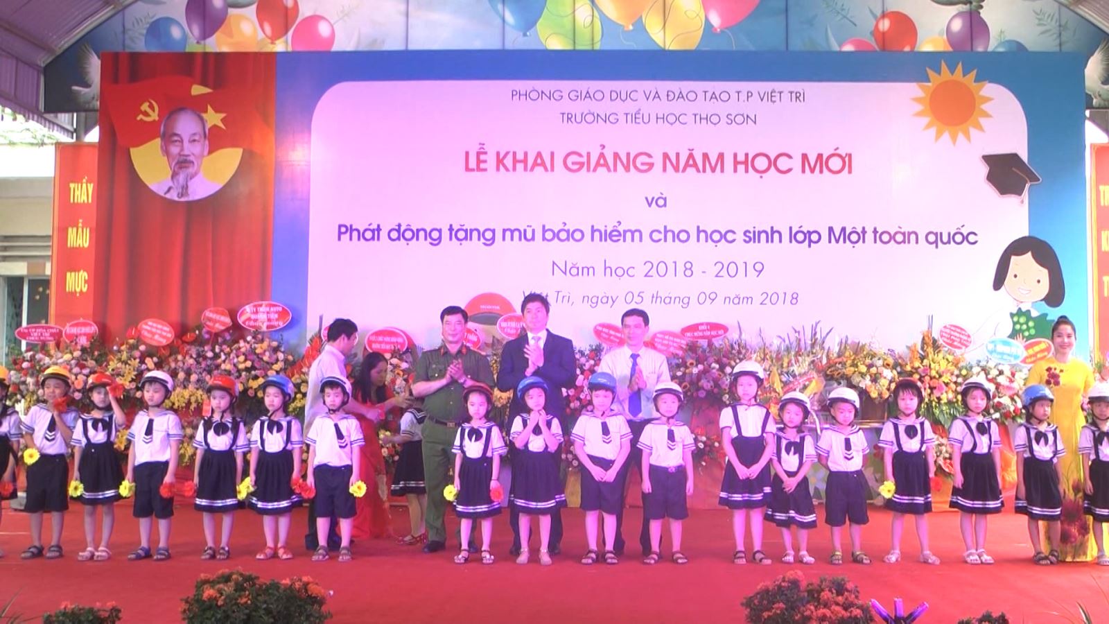 Đại diện Ban ATGT tỉnh, Công an tỉnh và Công ty Honda Việt Nam trao tặng mũ bảo hiểm                                                        cho các em học sinh lớp 1 Trưởng tiểu học Thọ Sơn, thành phố Việt trì nhân dịp khai giảng năm học mới 2018 -2019