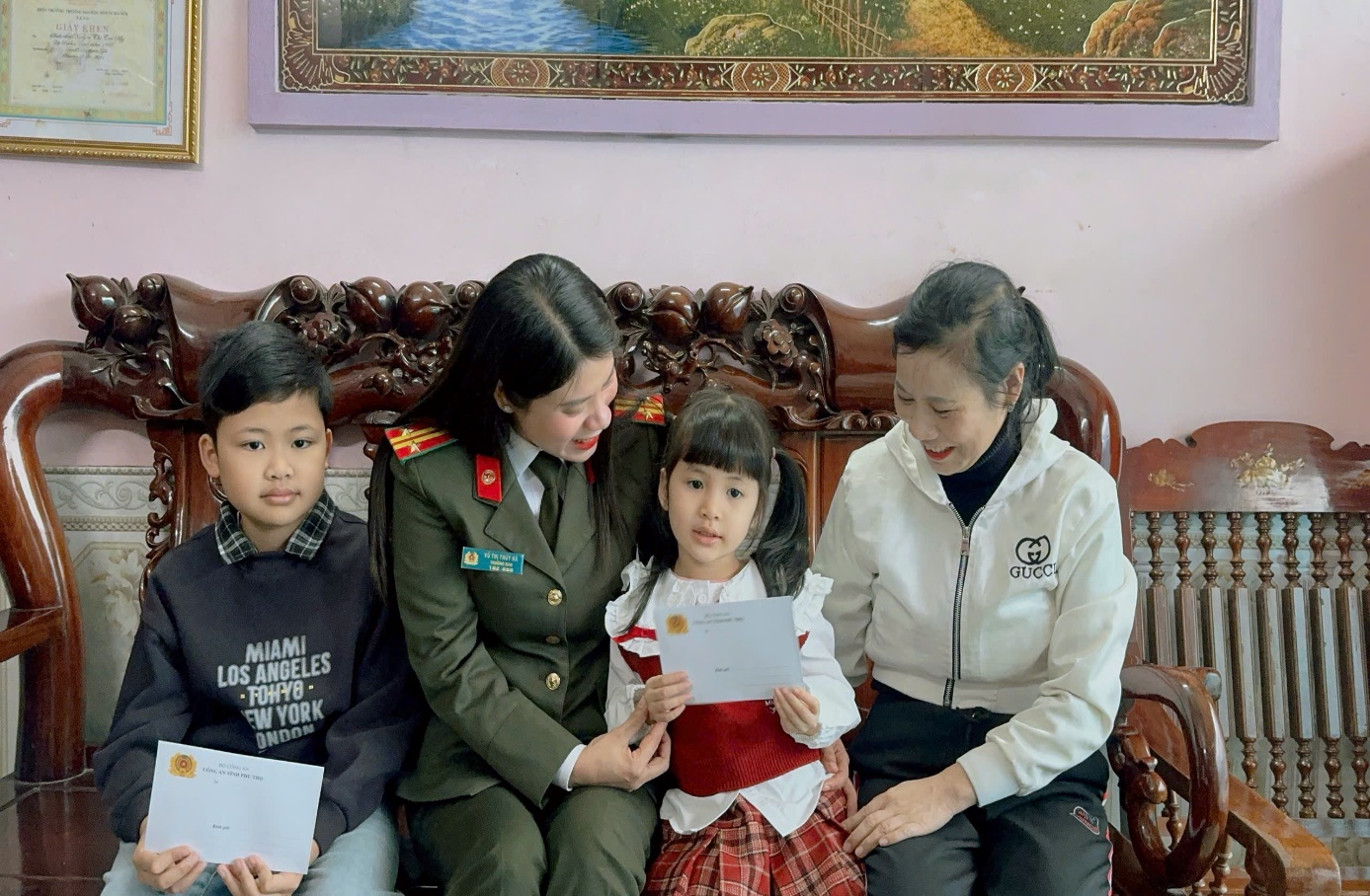 Trung tá Vũ Thị Thúy Hà, Trưởng ban Phụ nữ, Ủy viên thường trực Ban Vì sự tiến bộ phụ nữ, công tác gia đình và trẻ em Công an tỉnh ân cần hỏi thăm tình hình học tập của 02 con đỡ đầu