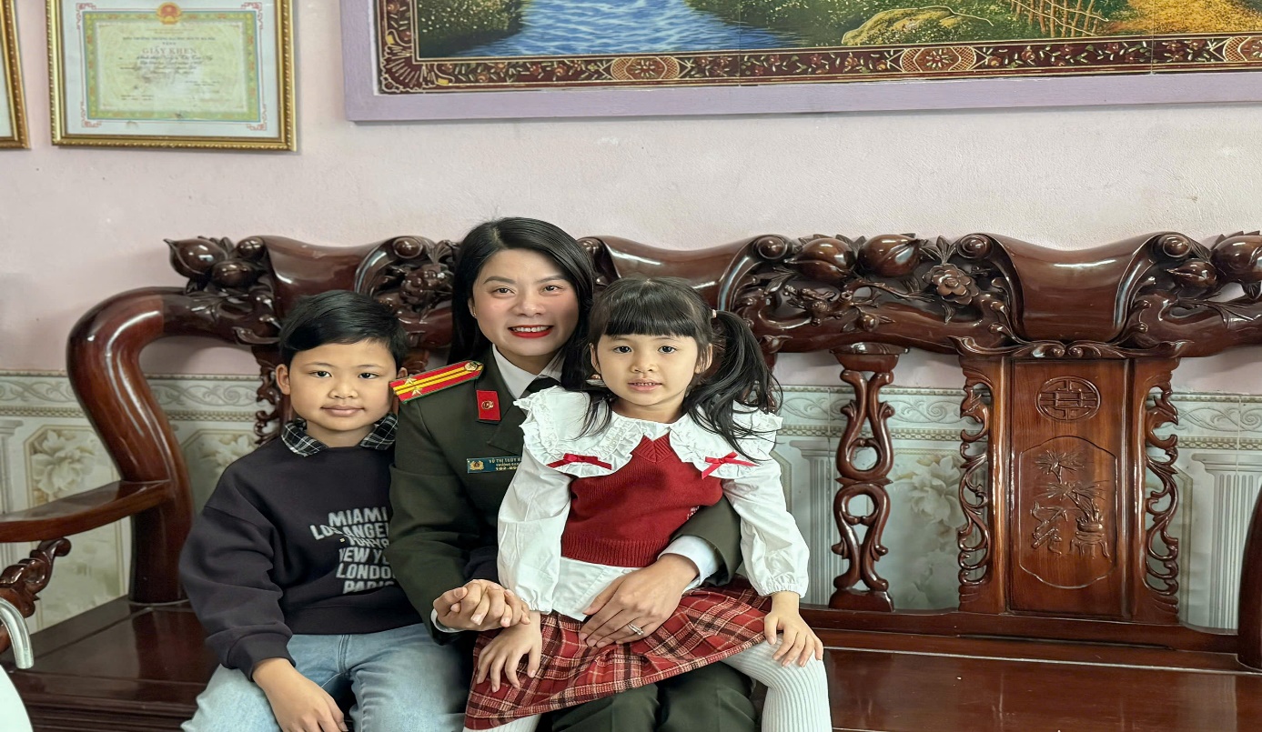 Trung tá Vũ Thị Thúy Hà, Trưởng ban Phụ nữ, Ủy viên thường trực Ban Vì sự tiến bộ phụ nữ, công tác gia đình và trẻ em Công an tỉnh chụp ảnh cùng 02 con đỡ đầu