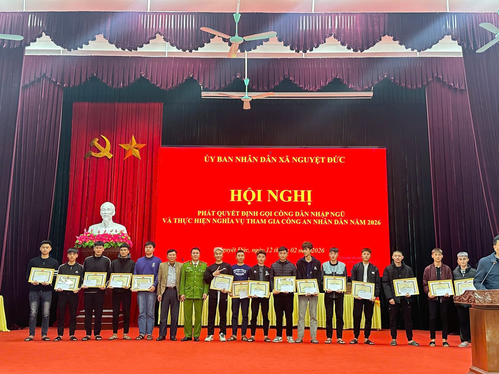 Buổi lễ được tổ chức với sự tham dự của đại diện cấp ủy, chính quyền địa phương, các ban, ngành, đoàn thể và các công dân đủ điều kiện thực hiện nghĩa vụ quân sự, nghĩa vụ tham gia Công an nhân dân năm 2026. Tại chương trình, lãnh đạo địa phương đã trao Quyết định gọi nhập ngũ cho 63 công dân, trong đó có 56 công dân thực hiện nghĩa vụ quân sự và 7 công dân thực hiện nghĩa vụ tham gia Công an nhân dân.
