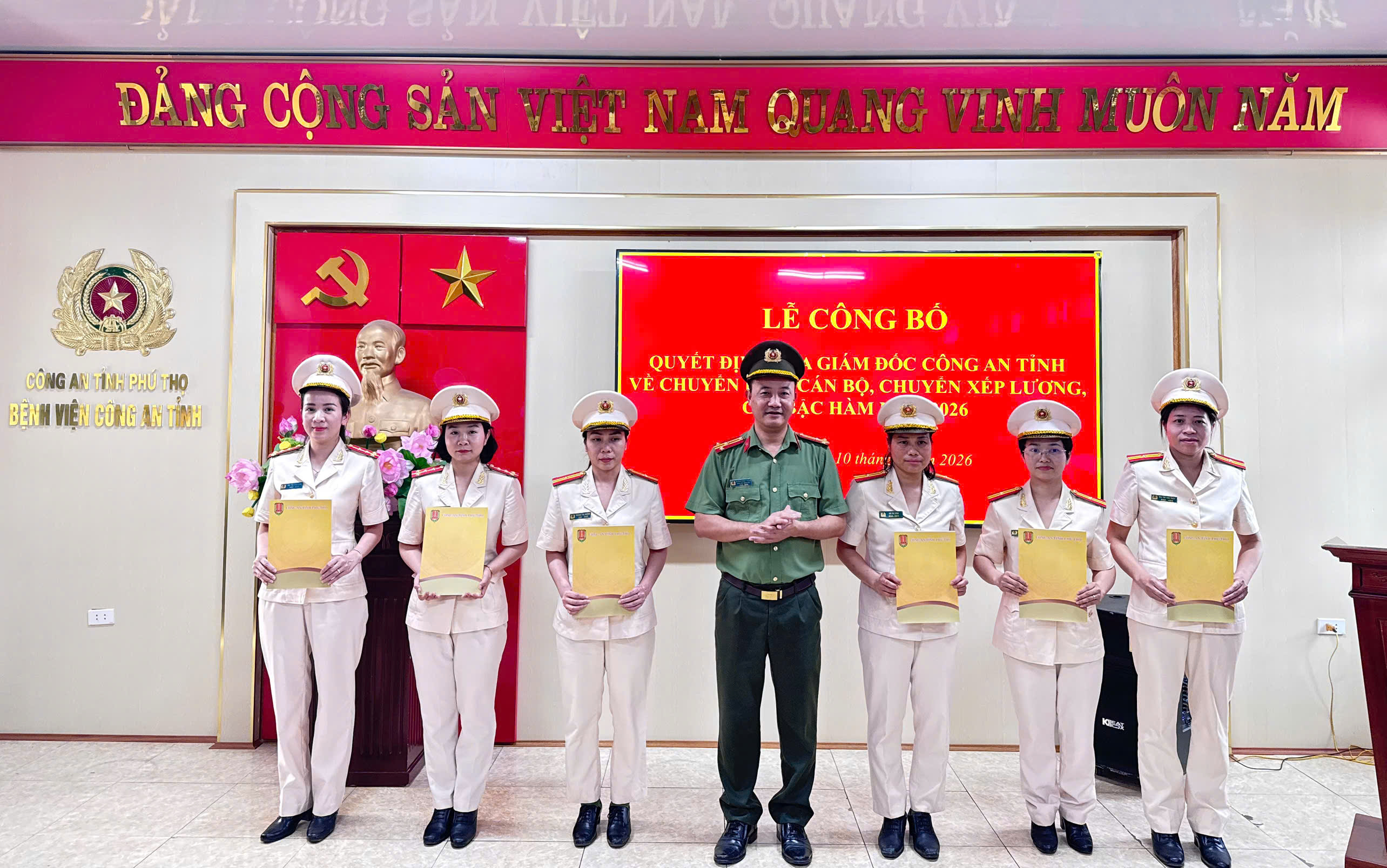 Ngày 10/4/2026, Bệnh viện Công an tỉnh Phú Thọ đã tổ chức Lễ công bố Quyết định của Giám đốc Công an tỉnh về việc chuyển loại cán bộ, chuyển xếp lương và cấp bậc hàm đối với cán bộ chiến sĩ (CBCS) năm 2026.