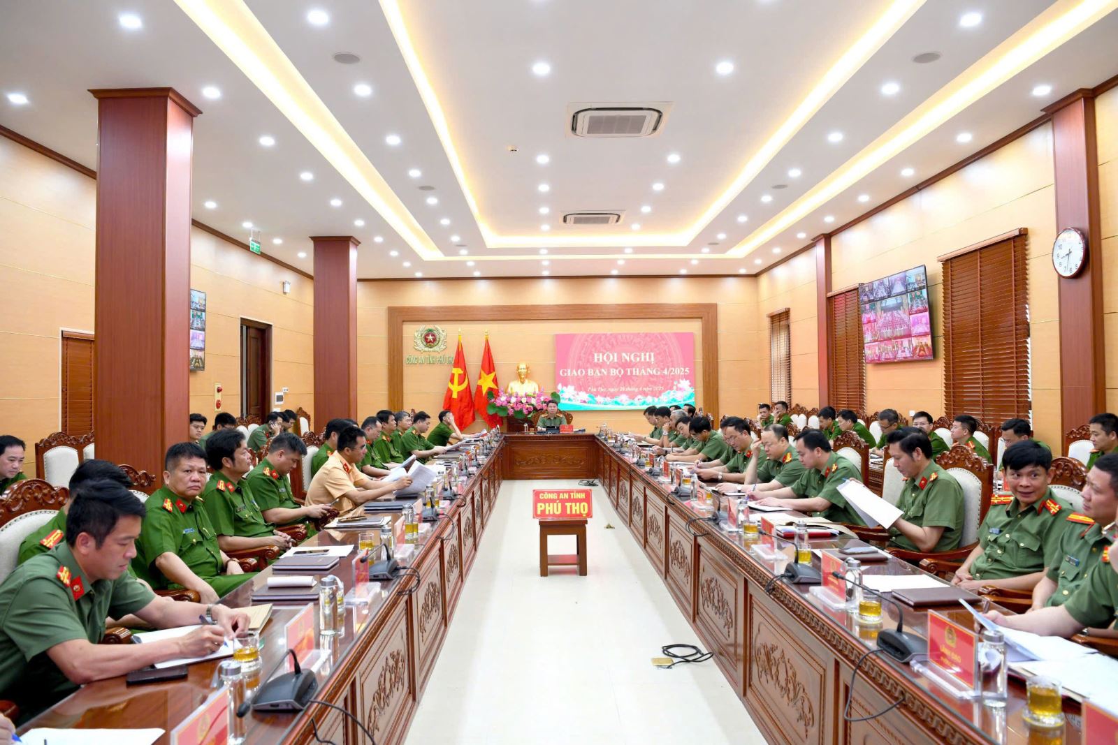 Sáng 28/4, tại Hà Nội, Bộ Công an tổ chức Hội nghị giao ban tháng 4/2025, triển khai công tác tháng 5/2025. Đại tướng Lương Tam Quang, Ủy viên Bộ Chính trị, Bí thư Đảng ủy Công an Trung ương, Bộ trưởng Bộ Công an chủ trì Hội nghị. Hội nghị được tổ chức theo hình thức trực tiếp kết hợp trực tuyến đến công an các đơn vị, địa phương. Tại điểm cầu Công an tỉnh Phú Thọ, đồng chí Đại tá Nguyễn Minh Tuấn, Ủy viên BTV Tỉnh ủy, Bí thư Đảng ủy, Giám đốc Công an tỉnh Phú Thọ chủ trì hội nghị. Dự hội nghị có các đồng chí trong Ban Giám đốc Công an tỉnh; lãnh đạo các phòng Công an tỉnh; Trưởng Công an các xã, phường trên địa bàn TP Việt Trì.