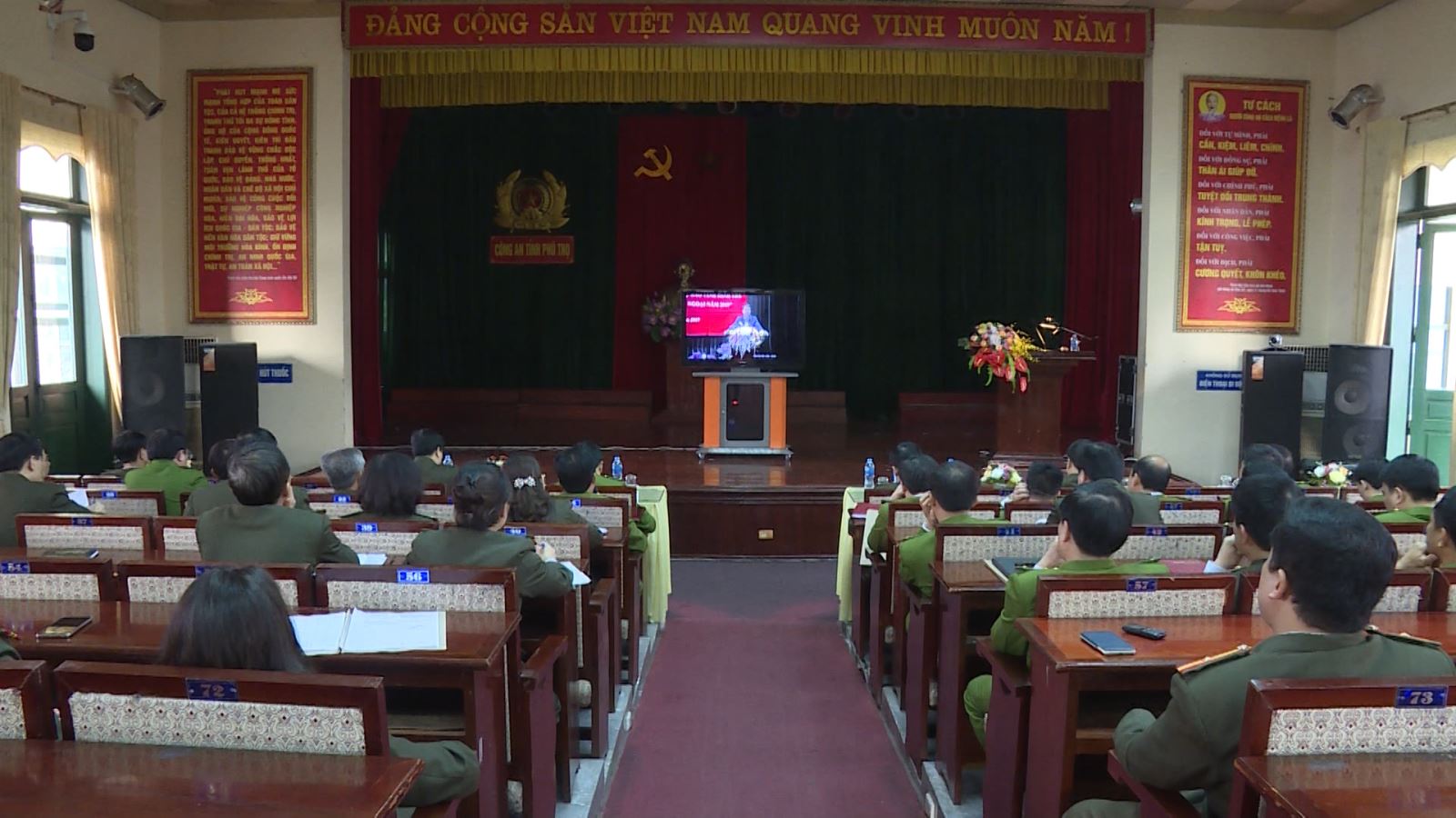 Toàn cảnh hội nghị trực tuyến. Đây là buổi giáo dục chính trị tư tưởng cho mỗi cán bộ, chiến sỹ thông qua đội ngũ lãnh đạo chủ chốt, đội ngũ báo cáo viên, cộng tác viên dư luận xã hội nhằm lan tỏa ý thức, trách nhiệm đến toàn thể cán bộ chiến sỹ Công an Phú Thọ trong công tác giữ gìn ANCT, TTATXH trên địa bàn nước./.