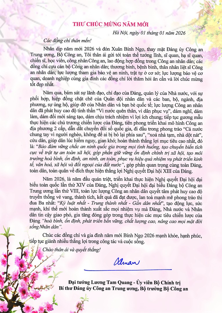 Nhân dịp năm mới 2026 và đón Xuân Bính Ngọ, Đại tướng Lương Tam Quang, Uỷ viên Bộ Chính trị, Bí thư Đảng uỷ Công an Trung ương, Bộ trưởng Bộ Công an có Thư Chúc mừng năm mới gửi tới toàn thể tướng lĩnh, sĩ quan, hạ sĩ quan, chiến sĩ, học viên, công nhân Công an, lao động hợp đồng trong Công an nhân dân; các đồng chí cựu cán bộ Công an nhân dân; thương binh, bệnh binh, thân nhân liệt sĩ Công an nhân dân; lực lượng tham gia bảo vệ an ninh, trật tự ở cơ sở; lực lượng bảo vệ cơ quan, doanh nghiệp cùng gia đình. Cổng Thông tin điện tử Bộ Công an trân trọng giới thiệu toàn văn Thư Chúc mừng của đồng chí Bộ trưởng.