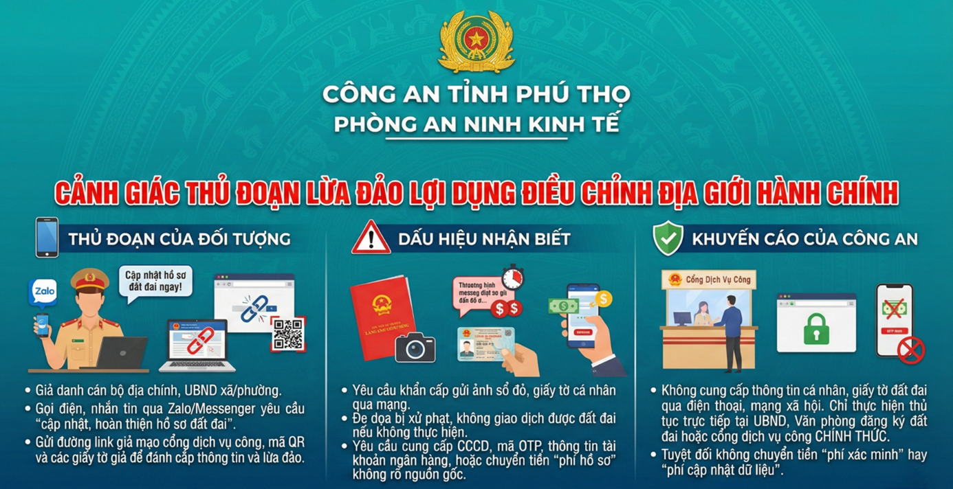 Trước tình hình trên, Công an tỉnh Phú Thọ khuyến cáo người dân nâng cao cảnh giác, tuyệt đối không cung cấp thông tin cá nhân, giấy tờ đất đai cho người lạ qua điện thoại hoặc mạng xã hội; chỉ thực hiện thủ tục hành chính tại cơ quan có thẩm quyền hoặc thông qua cổng dịch vụ công chính thức của Nhà nước. Khi phát hiện dấu hiệu nghi vấn hoặc nghi ngờ bị lừa đảo, người dân cần kịp thời thông báo cho cơ quan Công an nơi gần nhất để được hỗ trợ, xử lý theo quy định pháp luật.