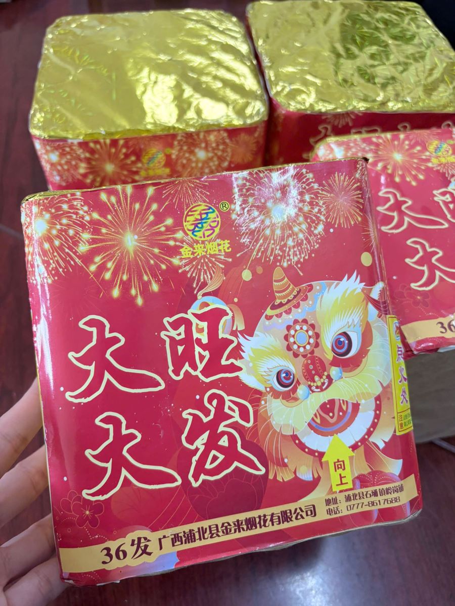 Tang vật thu giữ gồm 04 hộp pháo dạng khối trụ hình vuông, kích thước khoảng 14cm x 14cm, bên ngoài bọc màu vàng, đỏ, có chữ tiếng nước ngoài, kèm dây ngòi cháy màu xanh lá cây, với tổng trọng lượng khoảng 6,45kg.