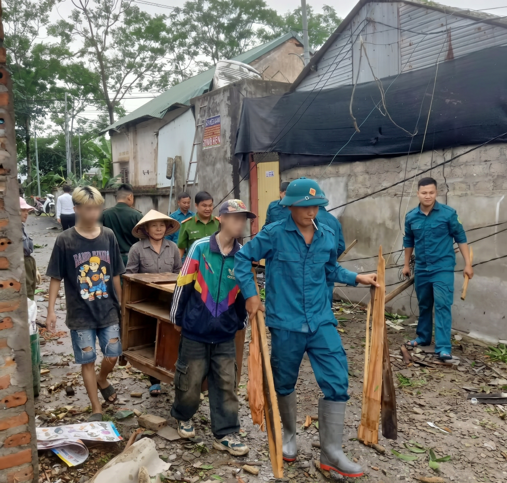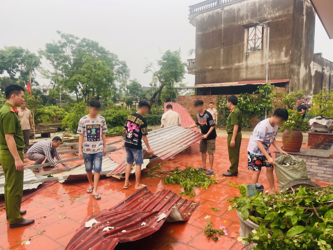 Công an xã huy động thanh thiếu niên có biểu hiện vi phạm pháp luật tham gia giúp đỡ người dân dọn dẹp sau giông lốc ngày 17/4/2026 tại địa bàn xã