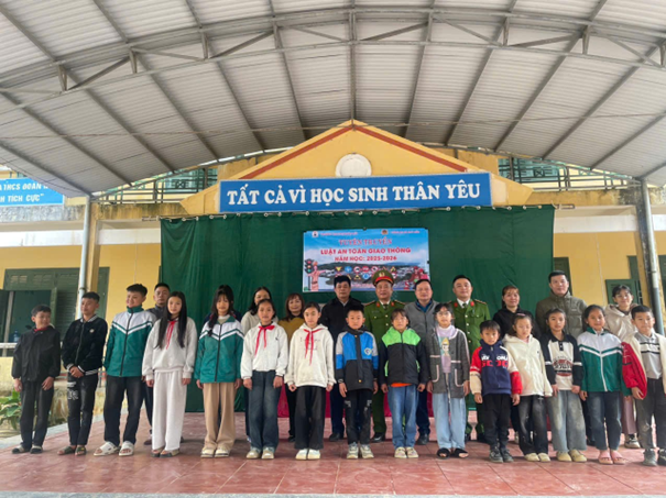 Chụp ảnh lưu niệm cùng các em học sinh và thầy cô giáo nhà trường Buổi tuyên truyền diễn ra trong không khí sôi nổi, nghiêm túc; các em học sinh tích cực tham gia trả lời câu hỏi, trao đổi kiến thức về an toàn giao thông. Thông qua hoạt động này, góp phần nâng cao nhận thức, trách nhiệm của học sinh, giáo viên và phụ huynh trong việc chấp hành các quy định của pháp luật về trật tự an toàn giao thông, đồng thời phát huy vai trò của nhà trường trong công tác giáo dục pháp luật cho thế hệ trẻ.