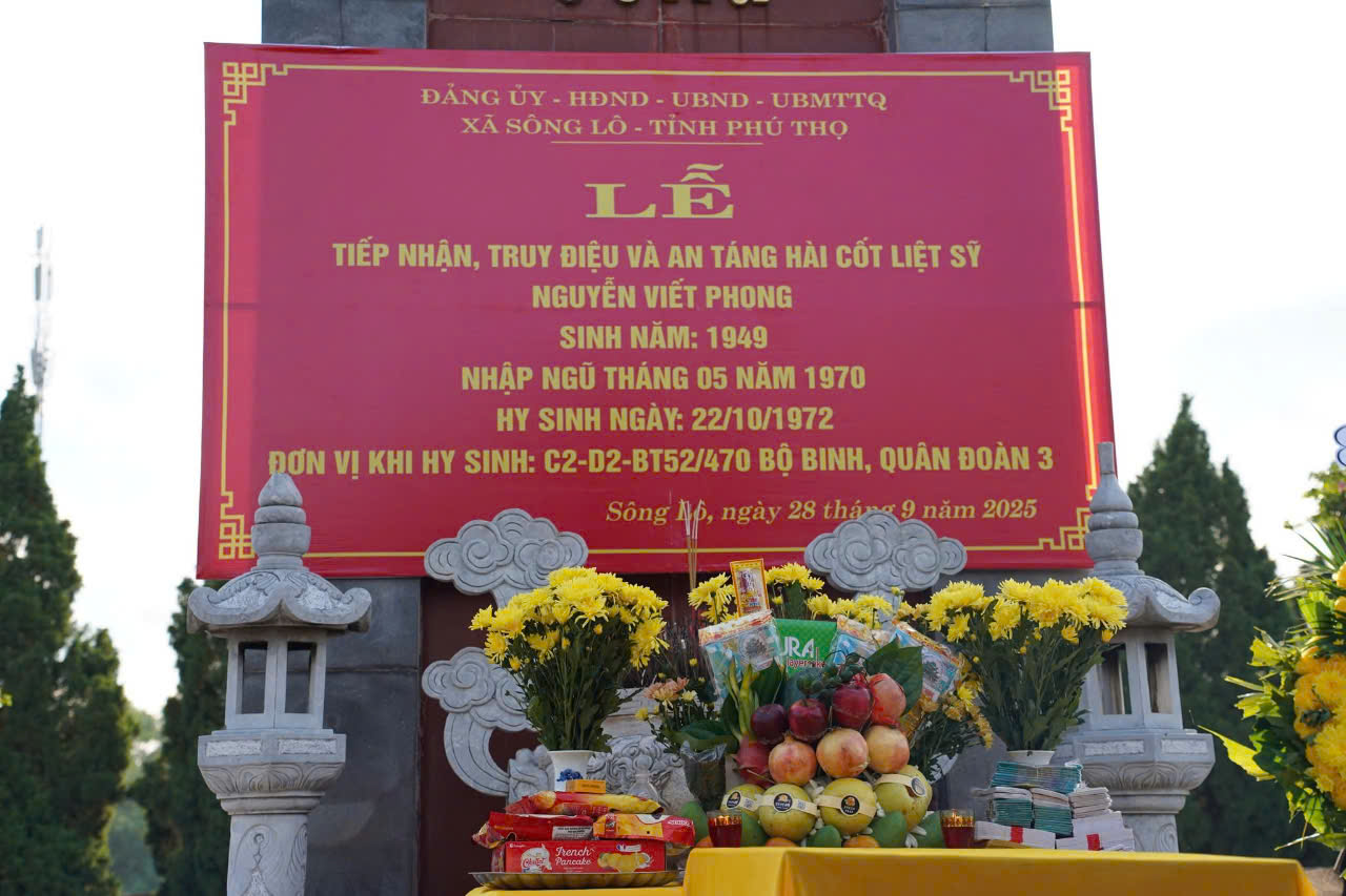Sáng ngày 28 tháng 9 năm 2025, Đảng ủy, HĐND, UBND, Ủy ban MTTQ Việt Nam xã Sông Lô cùng gia đình, các ban ngành, đoàn thể, lực lượng vũ trang và đông đảo nhân dân địa phương đã long trọng tổ chức Lễ đón nhận, truy điệu và an táng hài cốt liệt sĩ: Nguyễn Viết Phong được di chuyển từ Nghĩa Trang Liệt sĩ Quốc gia Trường Sơn, tỉnh Quảng Trị về nơi an táng tại Nghĩa trang Liệt sĩ Tứ Yên quê nhà.