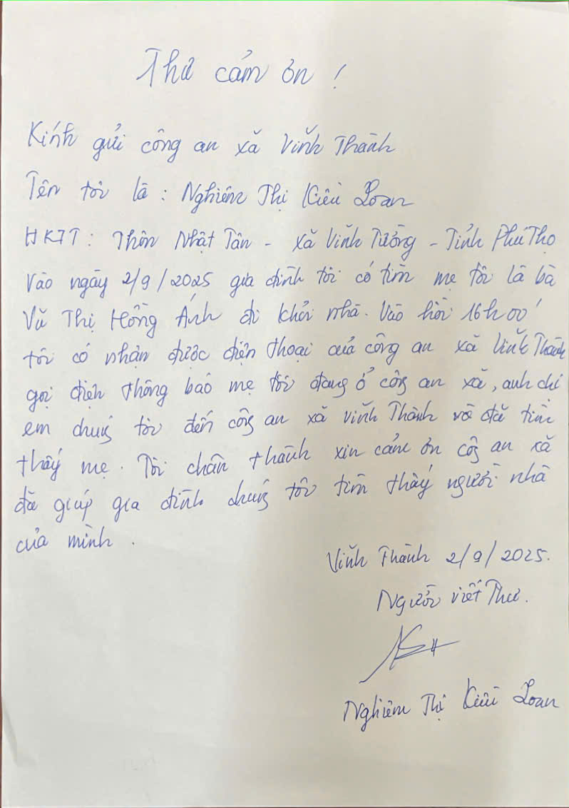 Con gái cụ Ánh đã viết thư gửi lời cảm ơn chân thành tới tập thể Công an xã Vĩnh Thành vì đã nhanh chóng hỗ trợ gia đình tìm được người thân. Trong thư, bà bày tỏ sự xúc động và biết ơn trước tinh thần trách nhiệm, tận tâm vì nhân dân phục vụ của các cán bộ, chiến sĩ Công an xã.