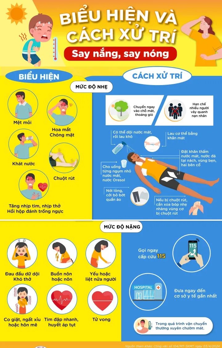 Các dấu hiệu nhận biết sớm của say nắng, say nóng gồm: mệt mỏi, khát nước nhiều, đau đầu, chóng mặt, buồn nôn, chuột rút cơ. Khi bệnh diễn biến nặng, người bệnh có thể sốt cao, da nóng đỏ, rối loạn ý thức, nói khó, mất định hướng, co giật hoặc ngất xỉu. Đây là những biểu hiện nguy hiểm cần cấp cứu ngay.
