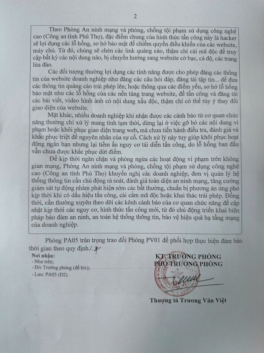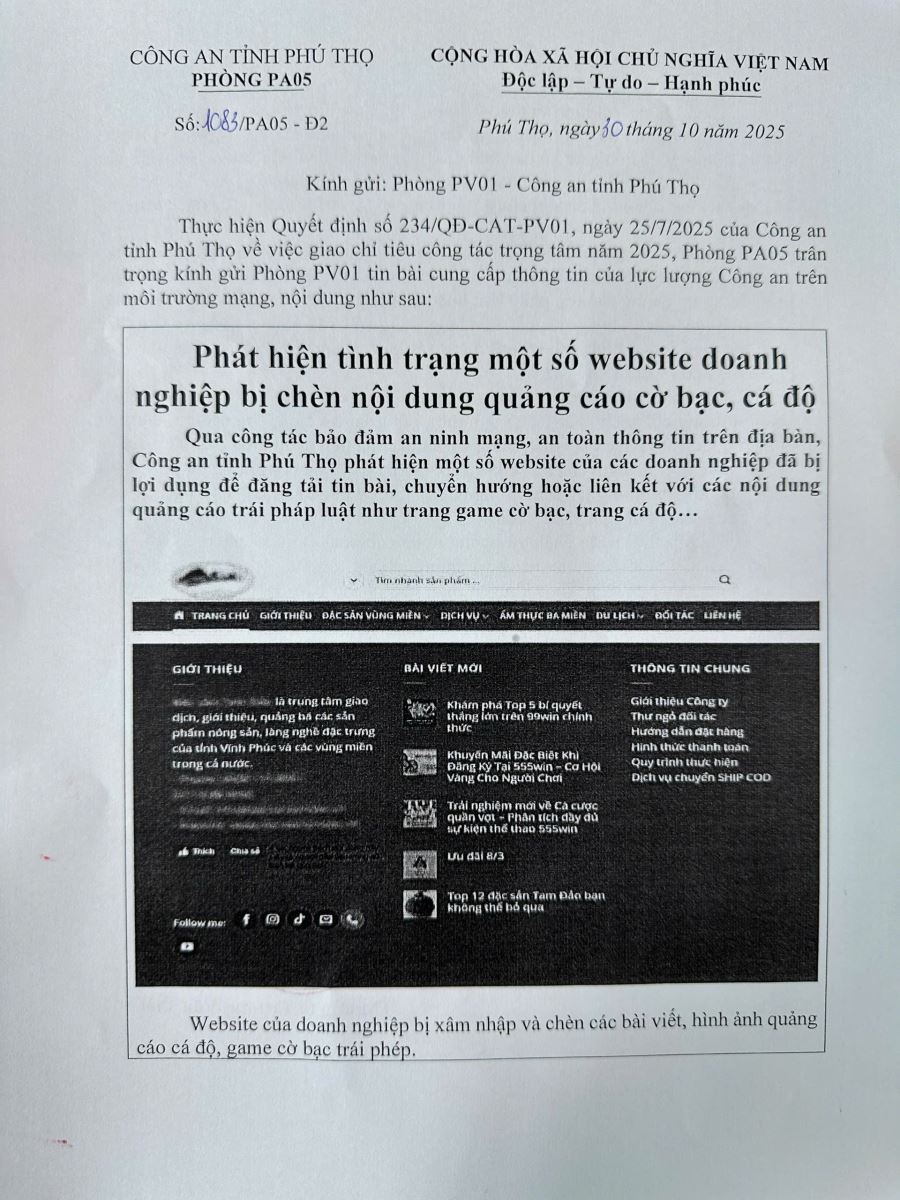 Thời gian gần đây, qua công tác bảo đảm an ninh mạng và an toàn thông tin, Công an tỉnh Phú Thọ phát hiện một số website của doanh nghiệp trên địa bàn bị lợi dụng để đăng tải, liên kết hoặc chuyển hướng đến các trang quảng cáo có nội dung cờ bạc, cá độ, vi phạm quy định pháp luật về an ninh mạng.