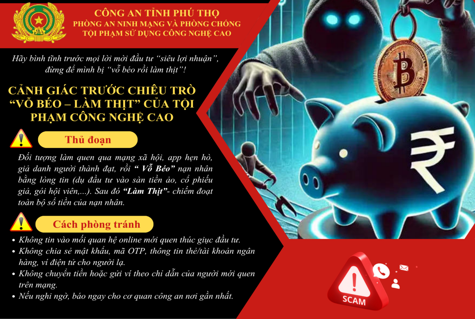 Thời gian gần đây, nhiều trường hợp người dân tại Việt Nam bị lừa đảo chiếm đoạt tài sản qua thủ đoạn “Pig Butchering Scam” hay còn gọi là “Vỗ béo - Làm thịt”, khiến dư luận quan tâm. Thủ đoạn này kết hợp giữa lừa tình trực tuyến và lừa đầu tư tài chính, xuất phát từ nước ngoài và đang lan rộng tại Việt Nam, gây thiệt hại nghiêm trọng cho người dân, đặc biệt là những người tham gia đầu tư trực tuyến hoặc sử dụng mạng xã hội thường xuyên.