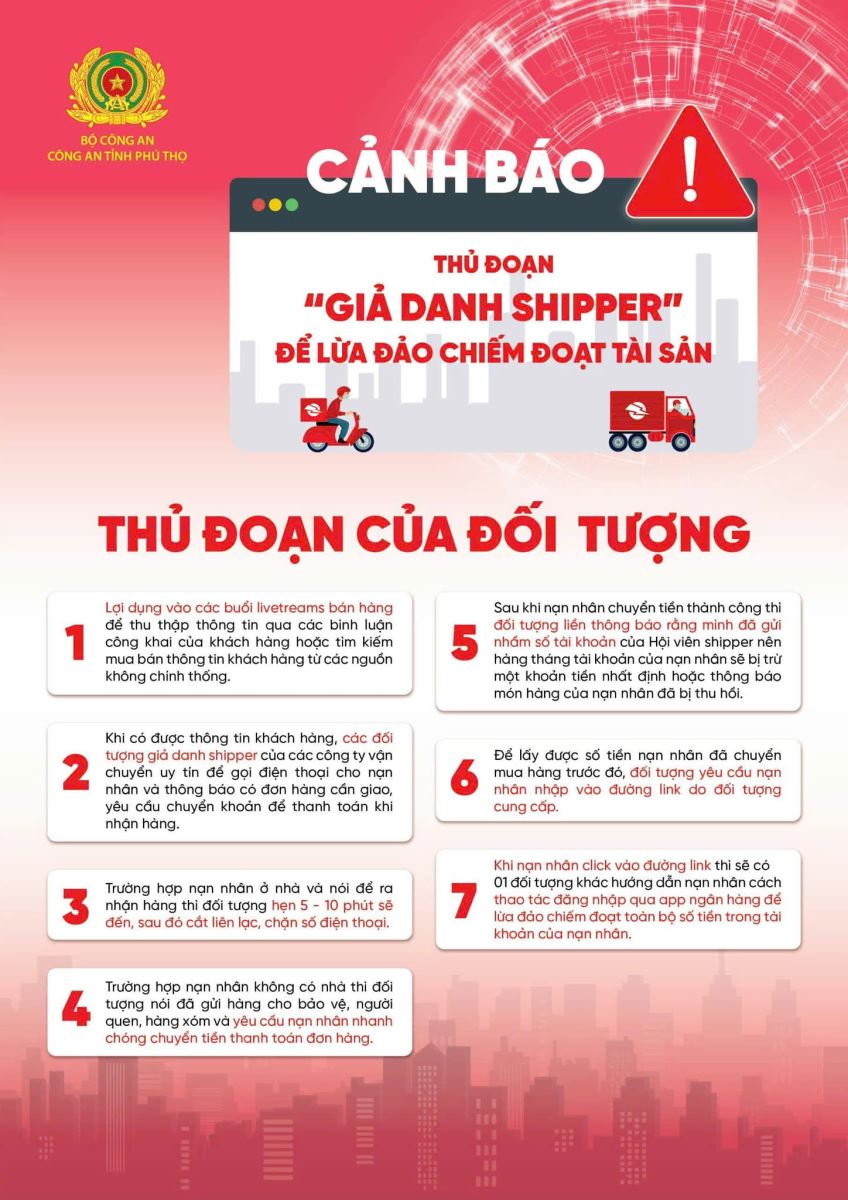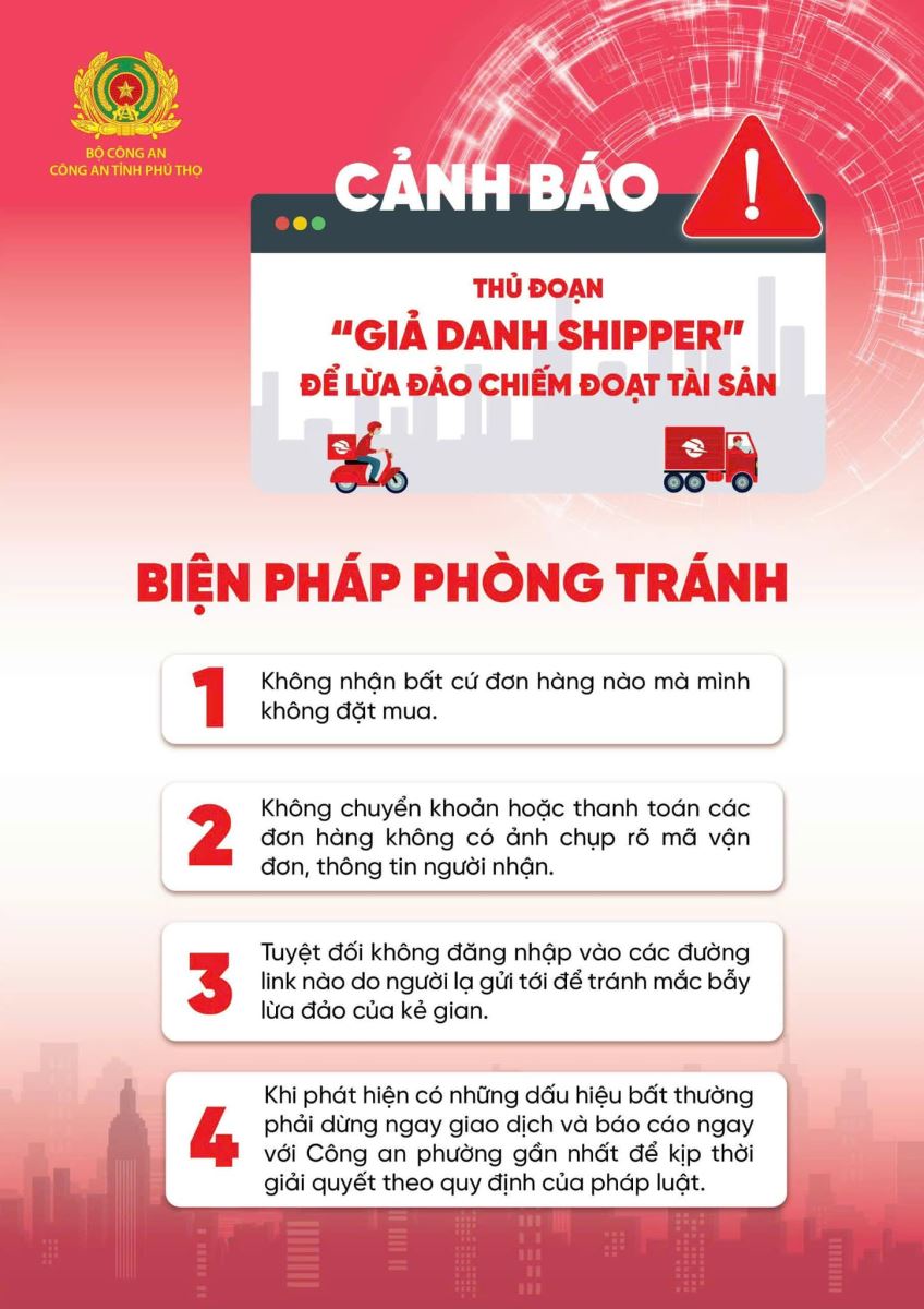 Phòng An ninh mạng và phòng chống tội phạm sử dụng Công nghệ cao, Công an tỉnh Phú Thọ khuyến cáo người dân cần nâng cao tinh thần cảnh giác: Không nhận bất cứ đơn hàng nào mà mình không đặt mua, không chuyển khoản hoặc thanh toán các đơn hàng không có ảnh chụp rõ mã vận đơn, thông tin người nhận và tuyệt đối không click vào bất cứ đường link nào do người lạ gửi tới để tránh “mắc bẫy” của kẻ gian. Khi phát hiện có những dấu hiệu bất thường phải dừng giao dịch ngay và cung cấp thông tin vụ việc cho lực lượng Công an nơi gần nhất.