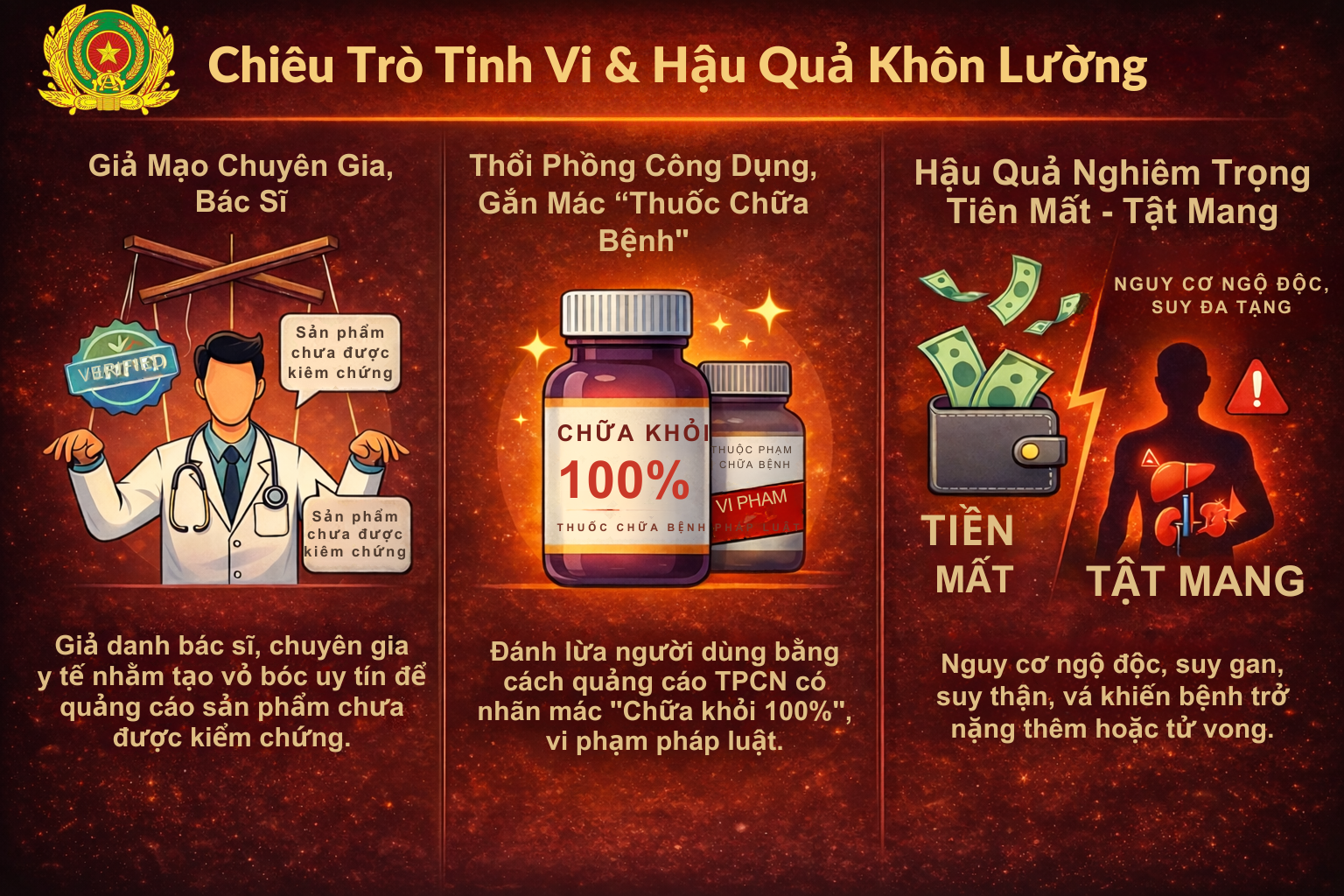 Trước thực trạng trên, các cơ quan chức năng khuyến cáo người dân cần nâng cao cảnh giác, trở thành người tiêu dùng thông thái. Tuyệt đối không tin vào các quảng cáo “chữa khỏi hoàn toàn”, “hiệu quả tức thì”. Không mua thuốc, thực phẩm chức năng qua mạng xã hội, livestream, tin nhắn riêng hoặc các kênh không được cấp phép. Việc khám bệnh, điều trị cần thực hiện theo tư vấn của bác sĩ có chứng chỉ hành nghề tại các cơ sở y tế hợp pháp.