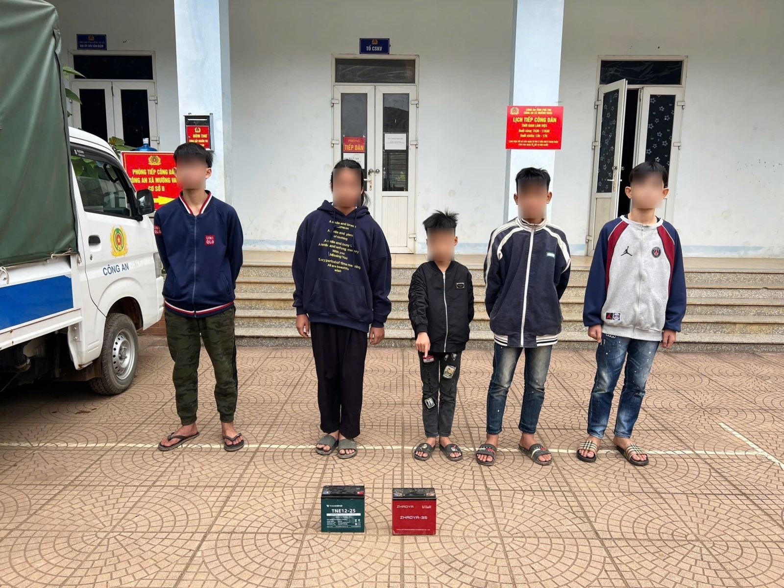 Bằng các biện pháp nghiệp vụ Công an xã Mường Vang đã xác định được B.T.Đ, sinh năm 2013, trú tại: Xóm Ấm, xã Nhân Nghĩa, tỉnh Phú Thọ; B.K.T, sinh năm: 2013, trú tại Xóm Đổn, xã Nhân Nghĩa, tỉnh Phú Thọ; B.V.C, sinh năm: 2012, trú tại: Xóm Đồi, xã Nhân Nghĩa, tỉnh Phú Thọ; B.Q.K, sinh năm 2013, trú tại xóm Đa, xã Nhân Nghĩa, tỉnh Phú Thọ, B.T.Đ, sinh năm 2011, trú tại xóm Đa, xã Nhân Nghĩa, tỉnh Phú Thọ đã thực hiện hành vi trộm bình ắc quy xe điện trên địa bàn xã Mường Vang, tỉnh Phú Thọ. Công an xã Mường Vang đã lập hồ sơ xử phạt vi phạm hành chính đối với B.T.Đ sinh năm: 2011 bằng hình thức cảnh cáo, các trường hợp còn lại do chưa đủ tuổi xử phạt vi phạm hành chính nên đã cho viết cam kết giao cho gia đình quản lý.
