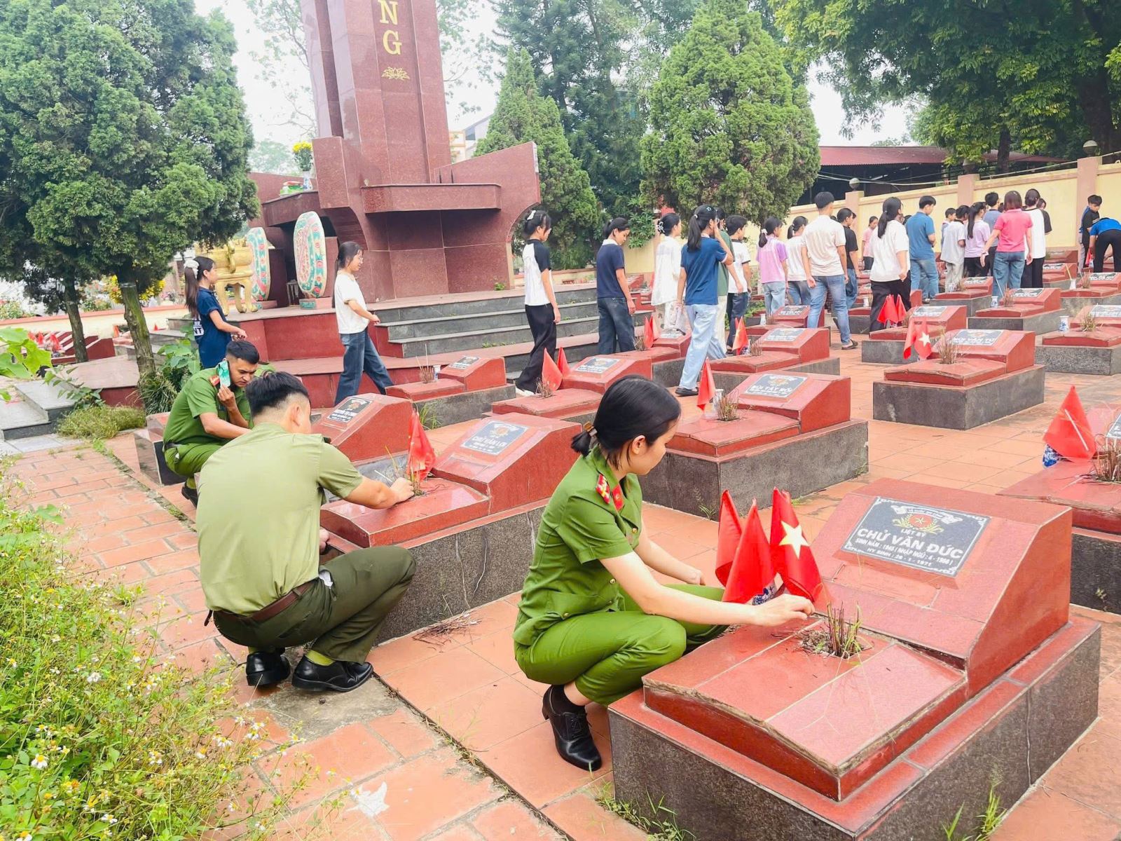 Đoàn viên Chi đoàn Công an xã đã đồng loạt ra quân tổng vệ sinh môi trường tại khu vực nghĩa trang liệt sĩ