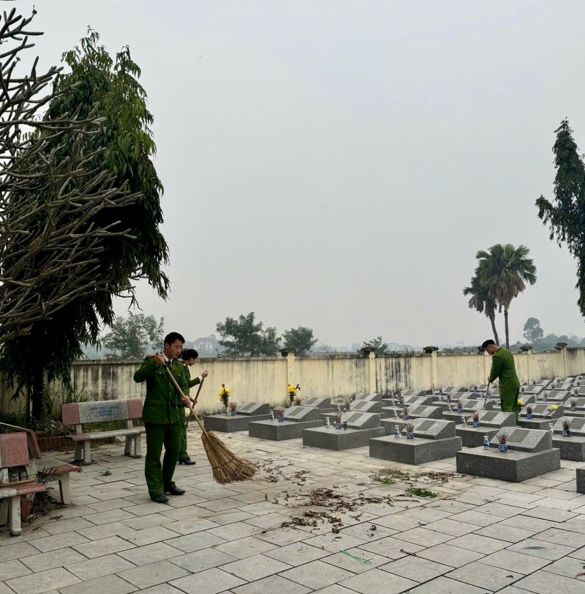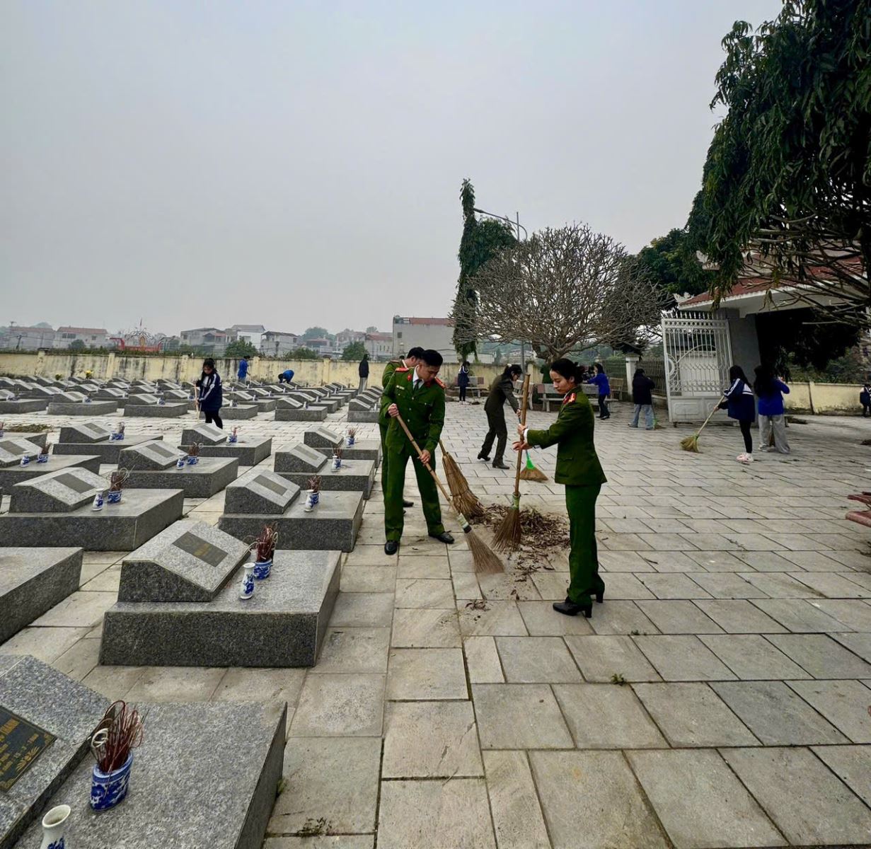 Chi đoàn Công an xã Tiên Lữ phối hợp ra quân chỉnh trang nghĩa trang liệt sĩ dịp Tết Bính Ngọ 2026