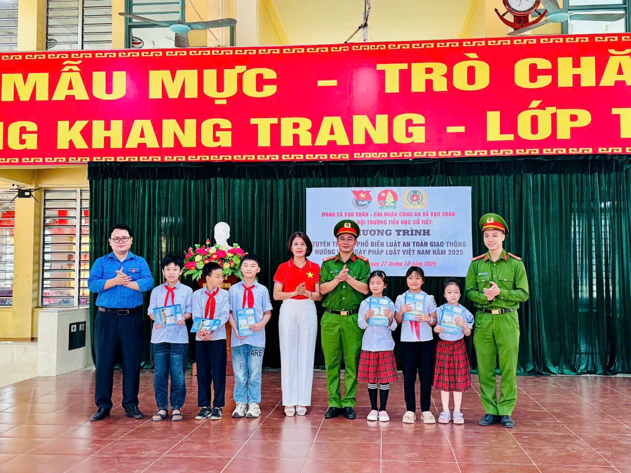 Hưởng ứng Ngày Pháp luật Việt Nam (9/11), ngày 27/10/2025, tại Trường Tiểu học Cổ Tiết, Chi đoàn Công an xã Vạn Xuân phối hợp với Đoàn xã Vạn Xuân tổ chức chương trình tuyên truyền, phổ biến Luật Giao thông đường bộ nhằm nâng cao nhận thức và ý thức chấp hành pháp luật về an toàn giao thông cho học sinh, đoàn viên và cán bộ, giáo viên nhà trường.