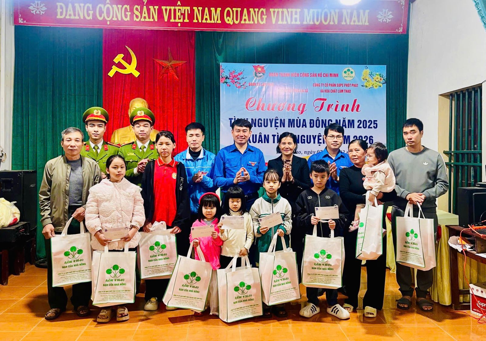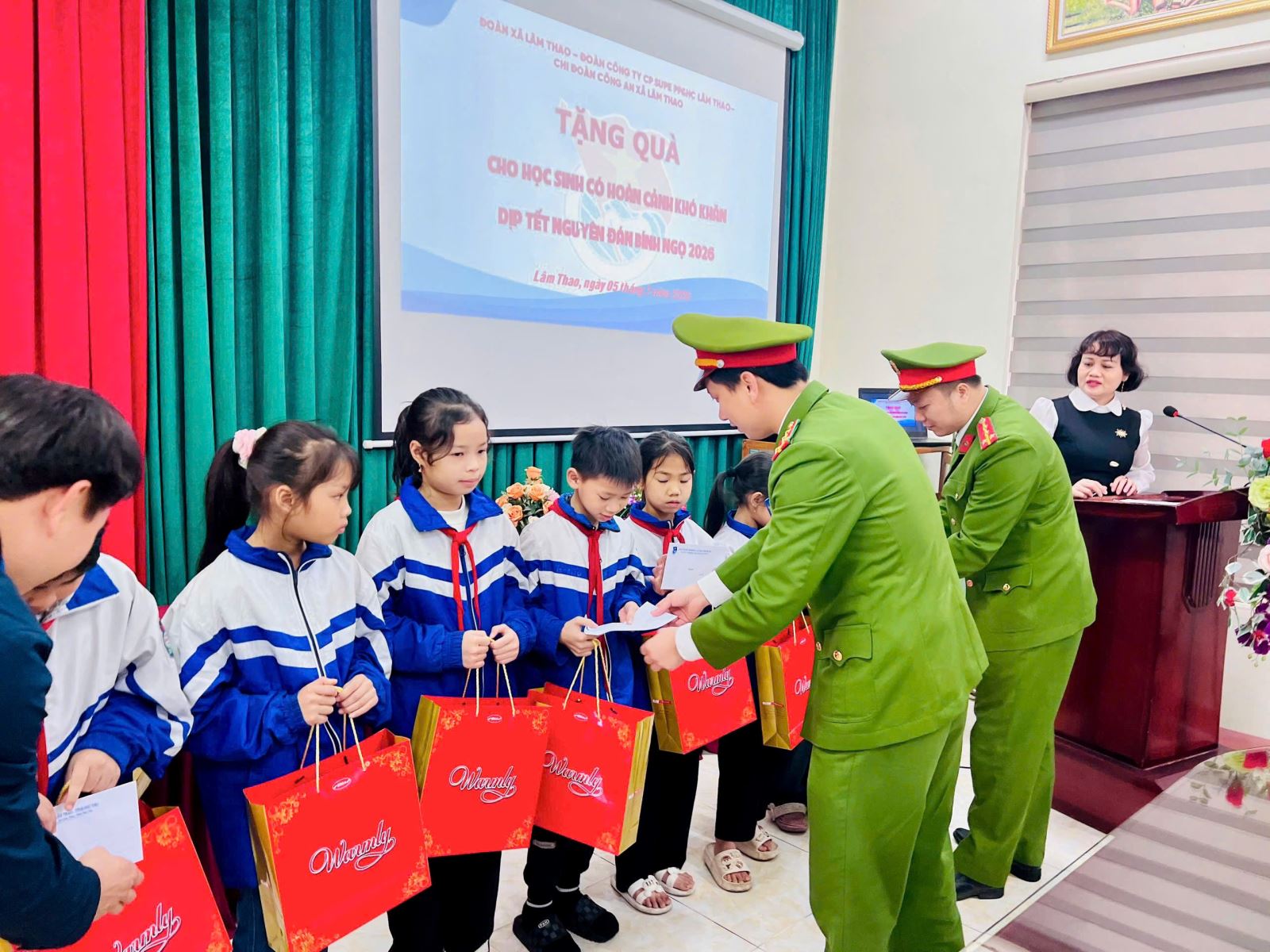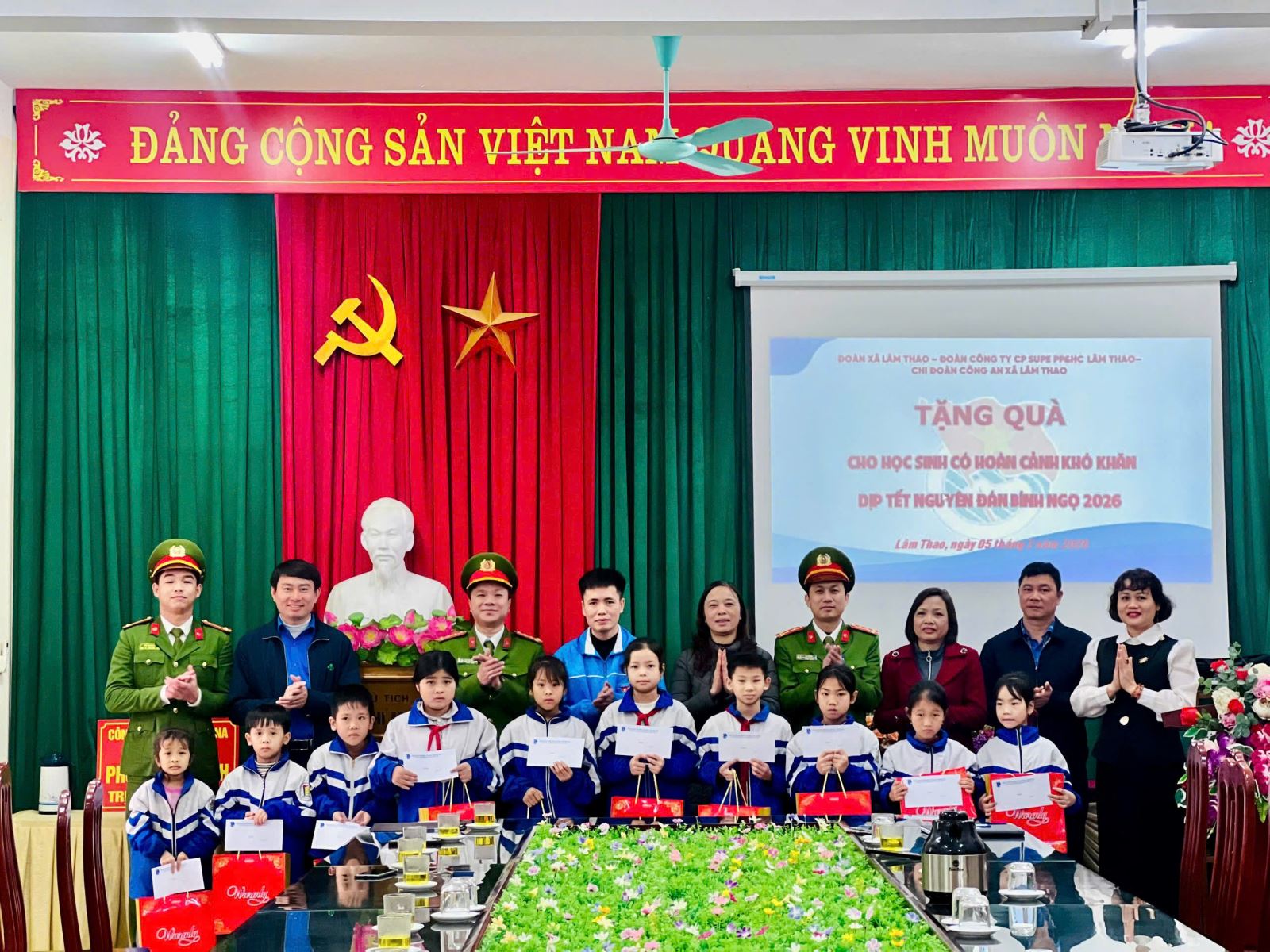 Thực hiện chuỗi các hoạt động “Tình nguyện mùa đông 2025 – Xuân tình nguyện 2026” và thiết thực chào đón Tết Nguyên đán Bính Ngọ 2026, trong hai ngày 05/02 và 07/02/2026, Chi đoàn Thanh niên Công an xã Lâm Thao đã phối hợp với Đoàn Thanh niên Cộng sản Hồ Chí Minh xã Lâm Thao và Đoàn Công ty Cổ phần Supe Phốt phát và Hóa chất Lâm Thao tổ chức chương trình trao quà cho học sinh có hoàn cảnh khó khăn trên địa bàn xã.