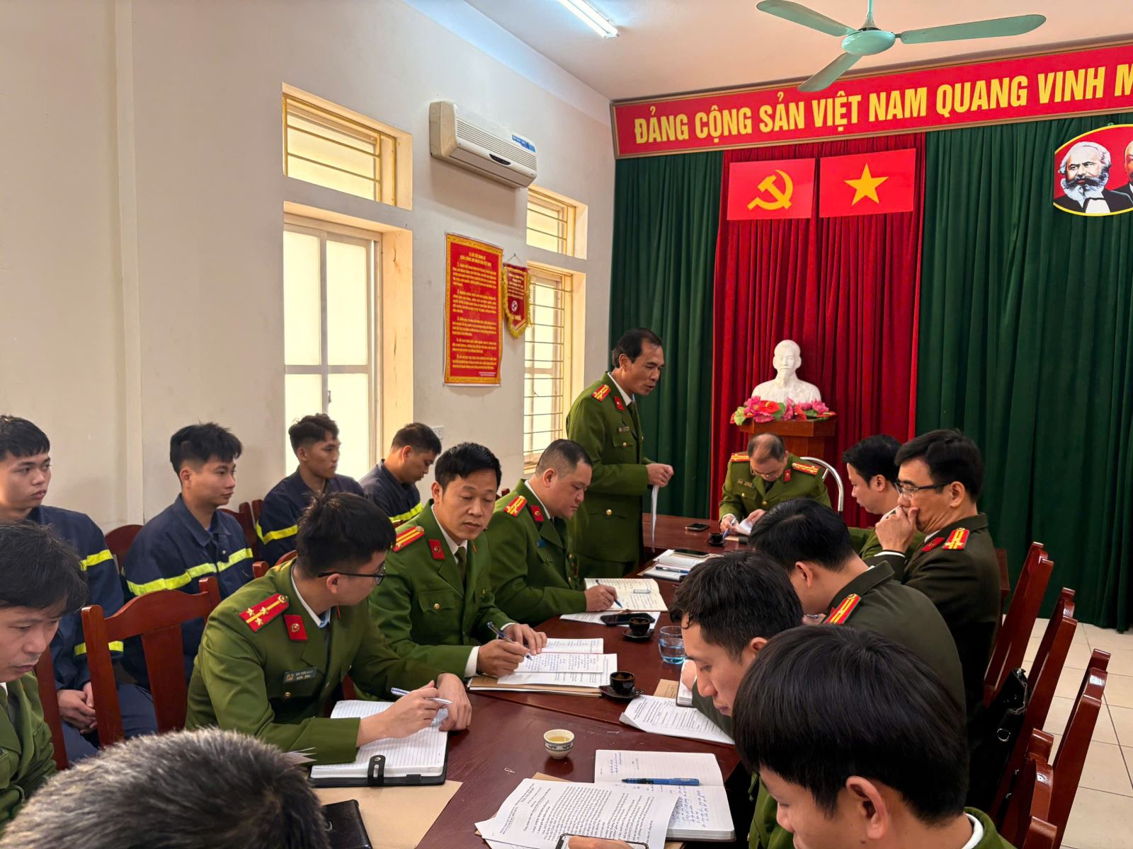 Tại buổi làm việc, đại diện Đội CC&CNCH khu vực Đền Hùng đã báo cáo tóm tắt tình hình, kết quả thực hiện các mặt công tác trong thời gian qua, tập trung vào công tác tham mưu, quản lý địa bàn, công tác thường trực sẵn sàng chiến đấu, huấn luyện nghiệp vụ, bảo đảm phương tiện, trang thiết bị và công tác phối hợp với các lực lượng liên quan. Các ý kiến tại buổi làm việc đã thẳng thắn đánh giá những kết quả đạt được, đồng thời chỉ rõ những tồn tại, hạn chế, khó khăn, vướng mắc trong quá trình thực hiện nhiệm vụ, nhất là trong điều kiện địa bàn rộng, số lượng cơ sở có nguy cơ cháy, nổ lớn và tính chất ngày càng phức tạp.