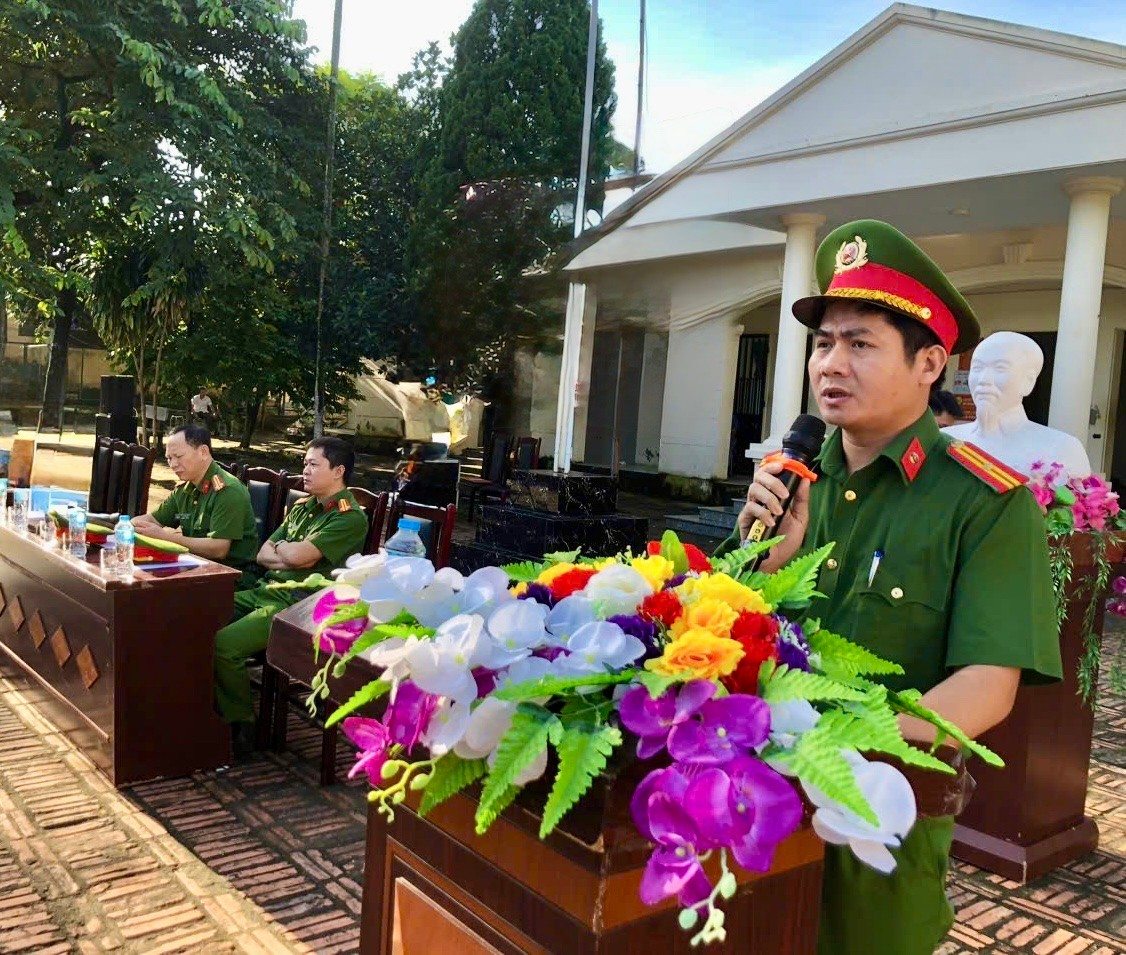 Thiếu tá Đỗ Văn Nuôi - Trưởng Cơ sở phát biểu tại buổi diễn tập Phát biểu khai mạc, Thiếu tá Đỗ Văn Nuôi - Trưởng Cơ sở nhấn mạnh: “Công tác cai nghiện ma túy là lĩnh vực đặc thù, tiềm ẩn nhiều yếu tố phức tạp. Việc tổ chức diễn tập giúp các lực lượng nắm vững quy trình, phản ứng nhanh, phối hợp hiệu quả khi có sự cố, đảm bảo an toàn tuyệt đối cho học viên và cán bộ.”