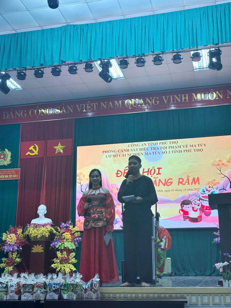 Trong không khí rộn ràng của Tết Trung thu năm 2025, tối 05/10, Cơ sở cai nghiện ma túy số 3 tỉnh Phú Thọ (thuộc Phòng Cảnh sát điều tra tội phạm về ma túy - Công an tỉnh Phú Thọ) đã tổ chức chương trình “Đêm hội trăng rằm” dành cho các cháu thiếu niên, nhi đồng là con cán bộ, chiến sĩ và người lao động trong đơn vị. Đây là hoạt động thường niên mang ý nghĩa nhân văn sâu sắc, thể hiện sự quan tâm của lãnh đạo, chỉ huy đối với đời sống tinh thần của cán bộ, chiến sĩ và gia đình.