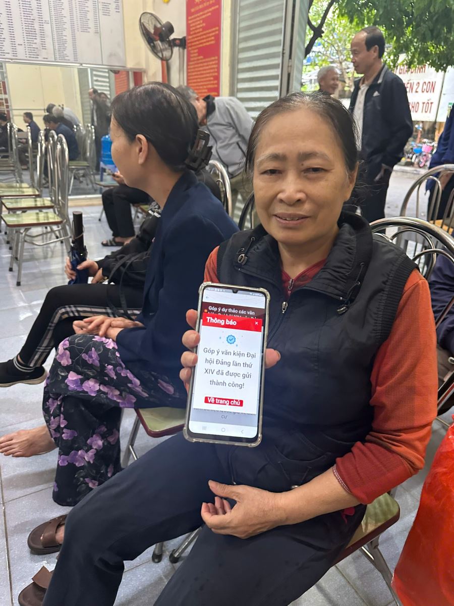 và đảng viên thực hiện góp ý qua ứng dụng VNeID Bên cạnh việc hướng dẫn trực tiếp, Công an phường còn đẩy mạnh tuyên truyền trực quan tại các điểm sinh hoạt cộng đồng, trụ sở tổ dân phố, nơi tập trung đông dân cư. Việc làm này không chỉ tạo điều kiện thuận lợi cho người dân tiếp cận thông tin mà còn góp phần lan tỏa tinh thần dân chủ, trách nhiệm và đoàn kết trong cộng đồng.
