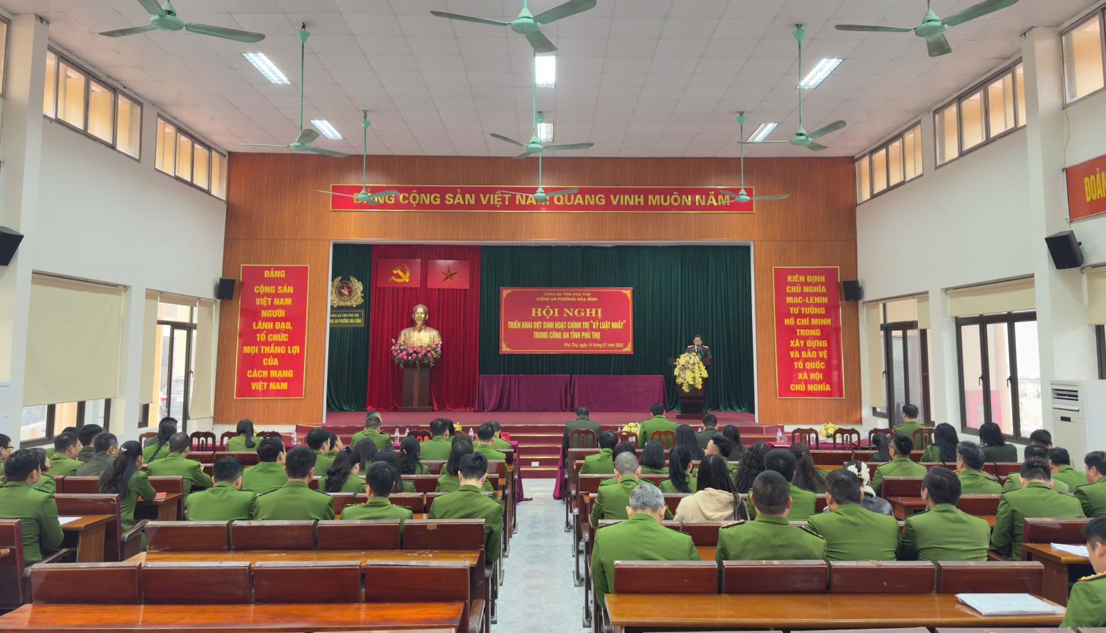 Thực hiện Kế hoạch của Công an tỉnh Phú Thọ về tổ chức đợt sinh hoạt chính trị siết chặt kỷ luật, kỷ cương, tăng cường quản lý cán bộ, chiến sĩ, sáng 14/01/2026, Công an phường Hòa Bình đã tổ chức Hội nghị triển khai đợt sinh hoạt chính trị với chủ đề “Kỷ luật nhất”.