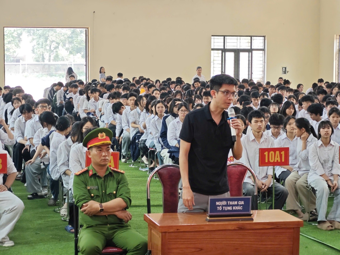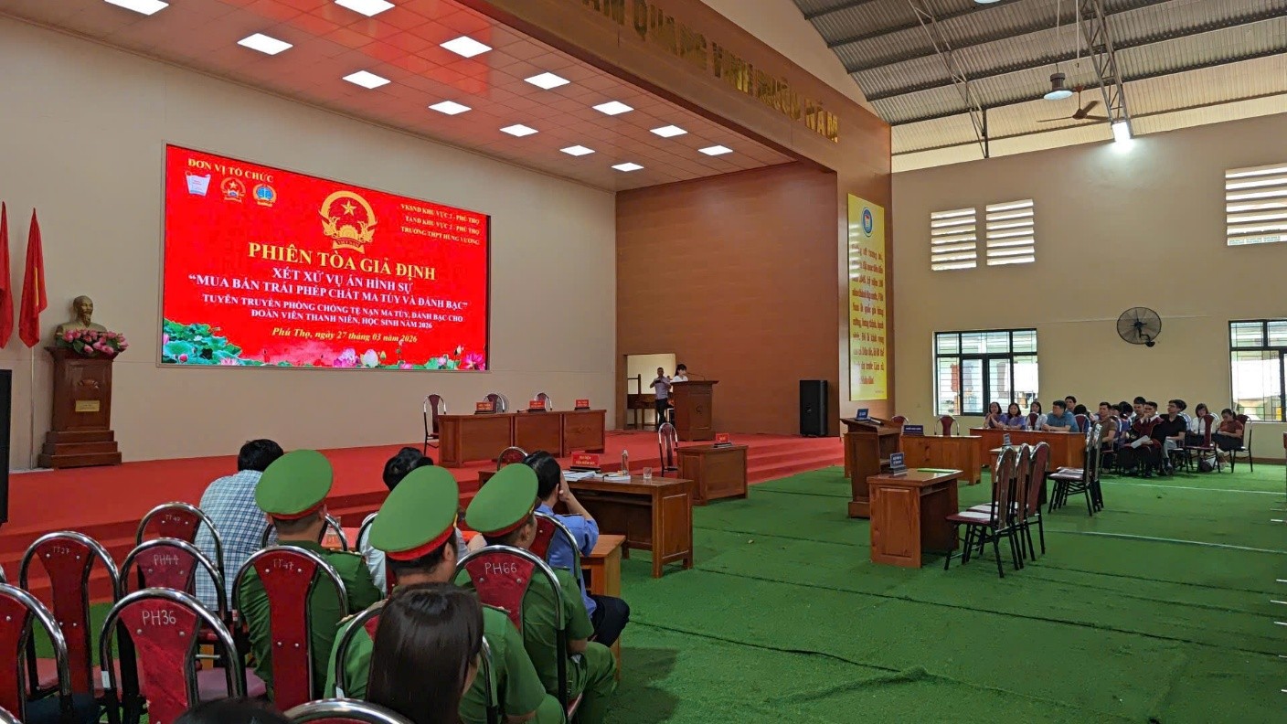 Trong lĩnh vực tuyên truyền pháp luật cho thanh thiếu niên, Công an phường Phú Thọ đã tham mưu, phối hợp với Viện kiểm sát nhân dân khu vực 2, Trường THPT Hùng Vương và Trường PTTH Nội trú tỉnh Phú Thọ tổ chức phiên tòa giả định tuyên truyền pháp luật cho khoảng 1.800 học sinh cùng 210 cán bộ, giáo viên nhà trường tham dự. Nội dung phiên tòa giả định tập trung tái hiện, xét xử các vụ án liên quan đến hành vi mua bán trái phép chất ma túy và đánh bạc – những hành vi vi phạm pháp luật tiềm ẩn nhiều nguy cơ trong lứa tuổi thanh thiếu niên. Các tình huống được xây dựng bám sát thực tế, thể hiện đầy đủ quá trình điều tra, truy tố, xét xử và tuyên án theo đúng quy định của pháp luật, giúp học sinh, giáo viên dễ tiếp cận, hiểu rõ hậu quả pháp lý của hành vi vi phạm, từ đó nâng cao ý thức tự giác chấp hành pháp luật.