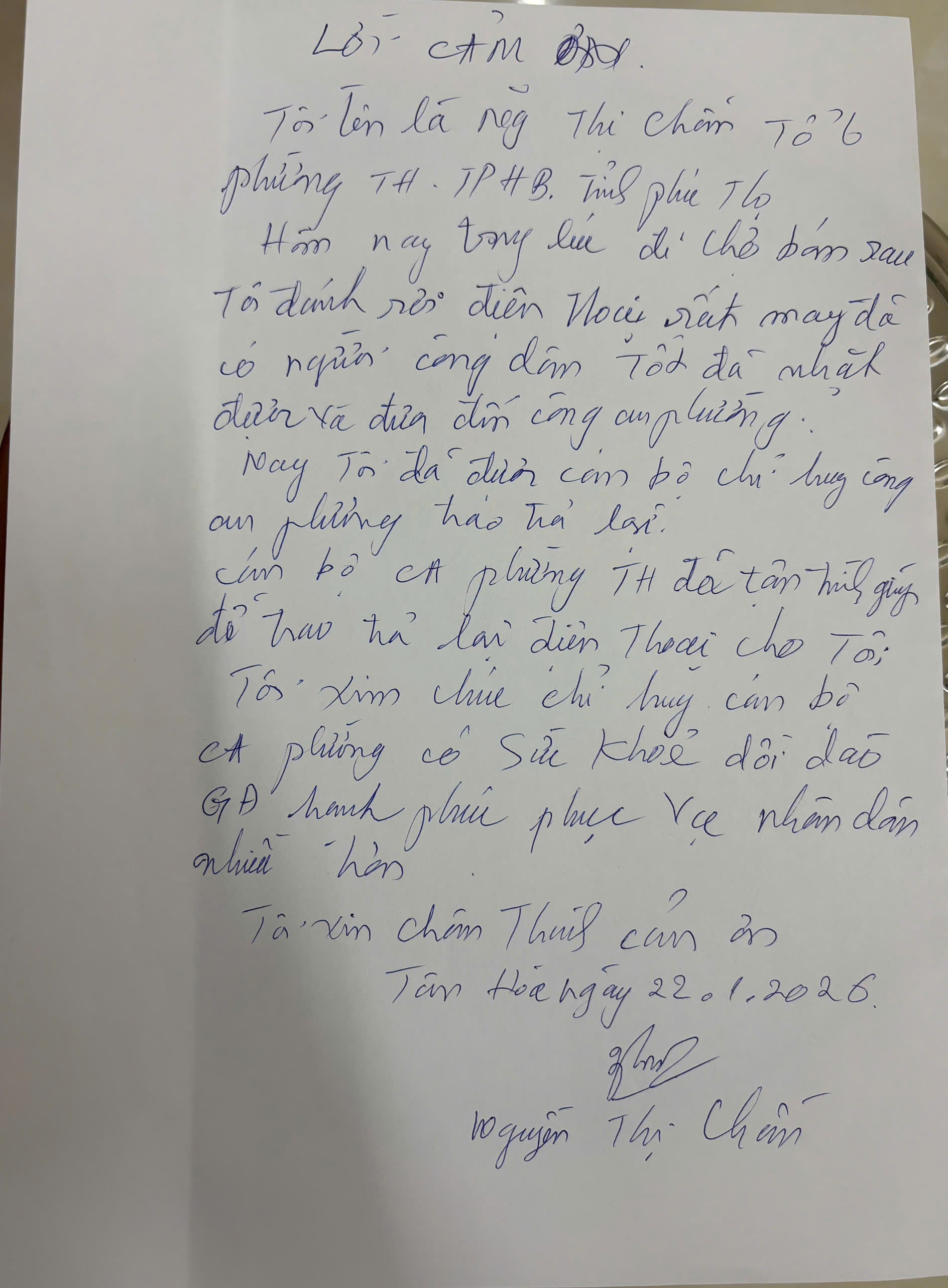 Hình ảnh thư cảm ơn của chủ điện thoại Qua đó, không chỉ thấy rõ hiệu quả của ứng dụng công nghệ số trong thực tiễn công tác, mà còn lan tỏa những giá trị tốt đẹp trong cộng đồng. Hành động trung thực, có trách nhiệm của công dân N.T.Đ. khi nhặt được của rơi và chủ động giao nộp cho cơ quan chức năng là tấm gương “Người tốt, việc tốt” tiêu biểu, rất đáng được biểu dương, góp phần xây dựng nếp sống văn minh, thượng tôn pháp luật trên địa bàn.