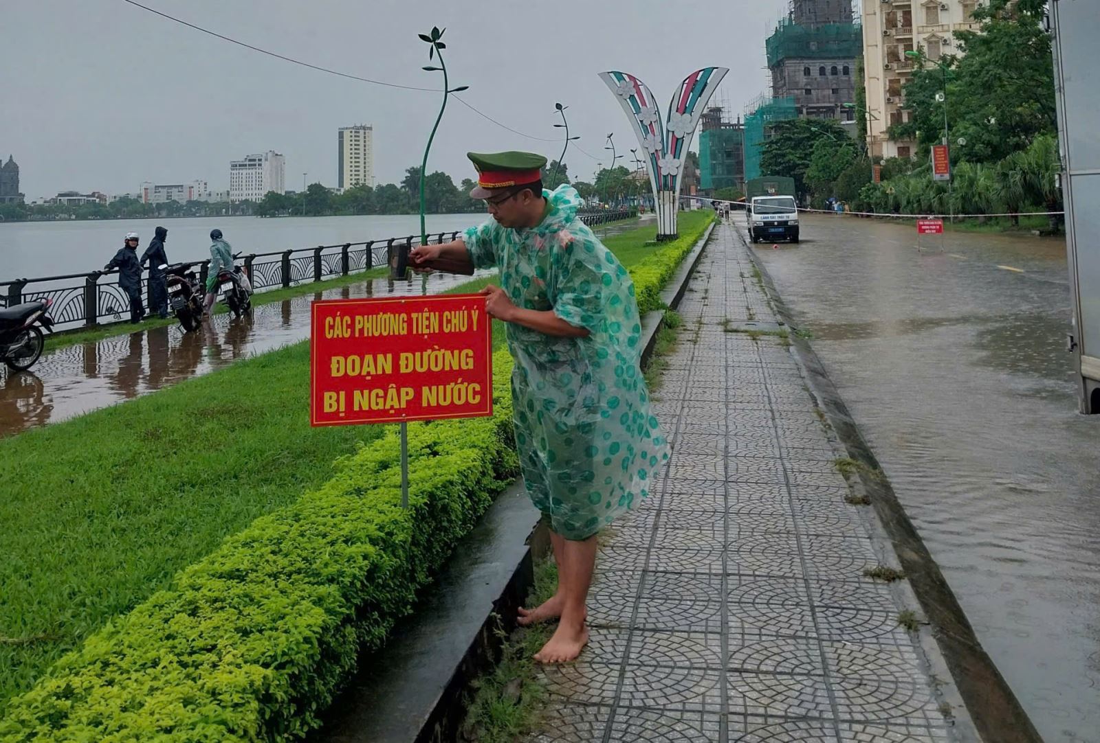 Thông qua công tác khảo sát thực tế, lực lượng đã xác định được nhiều điểm trọng yếu dễ xảy ra ngập úng cục bộ, đặc biệt là tại các tuyến đường thấp trũng, các khu vực ngập sâu và khu vực thoát nước yếu. Ngay sau đó, các biển cảnh báo nguy hiểm, biển cấm người và phương tiện lưu thông đã được đặt tại các vị trí xung yếu nhằm cảnh báo người dân không đi vào vùng nguy hiểm trong thời điểm mưa bão.