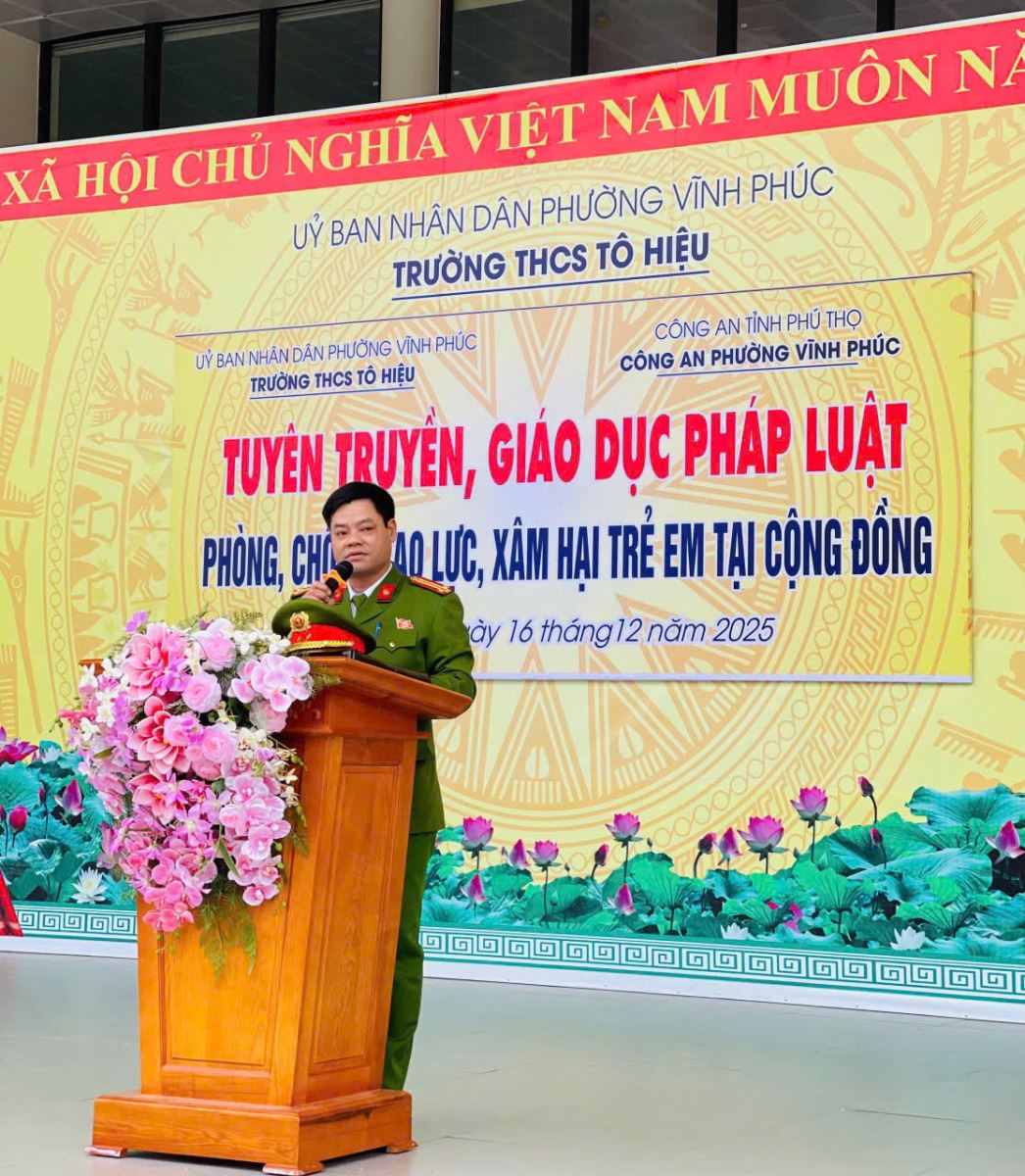 Ngày 16/12/2025, Công an phường Vĩnh Phúc phối hợp với Trường THCS Tô Hiệu tổ chức buổi tuyên truyền, phổ biến pháp luật về phòng, chống bạo lực học đường và xâm hại trẻ em, góp phần nâng cao nhận thức, kỹ năng phòng ngừa cho cán bộ, giáo viên và học sinh trên địa bàn.