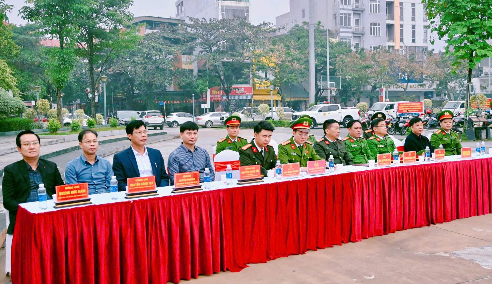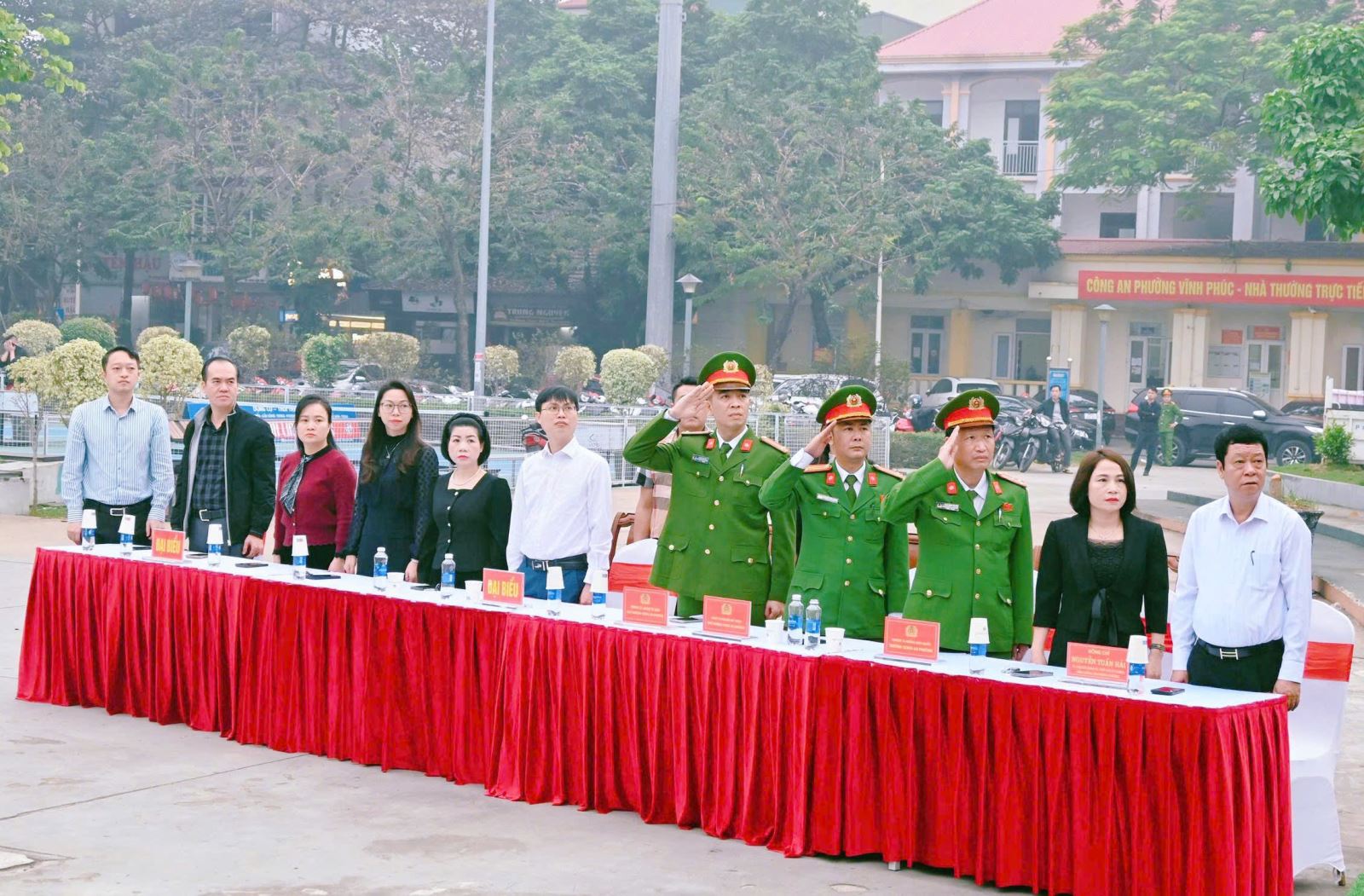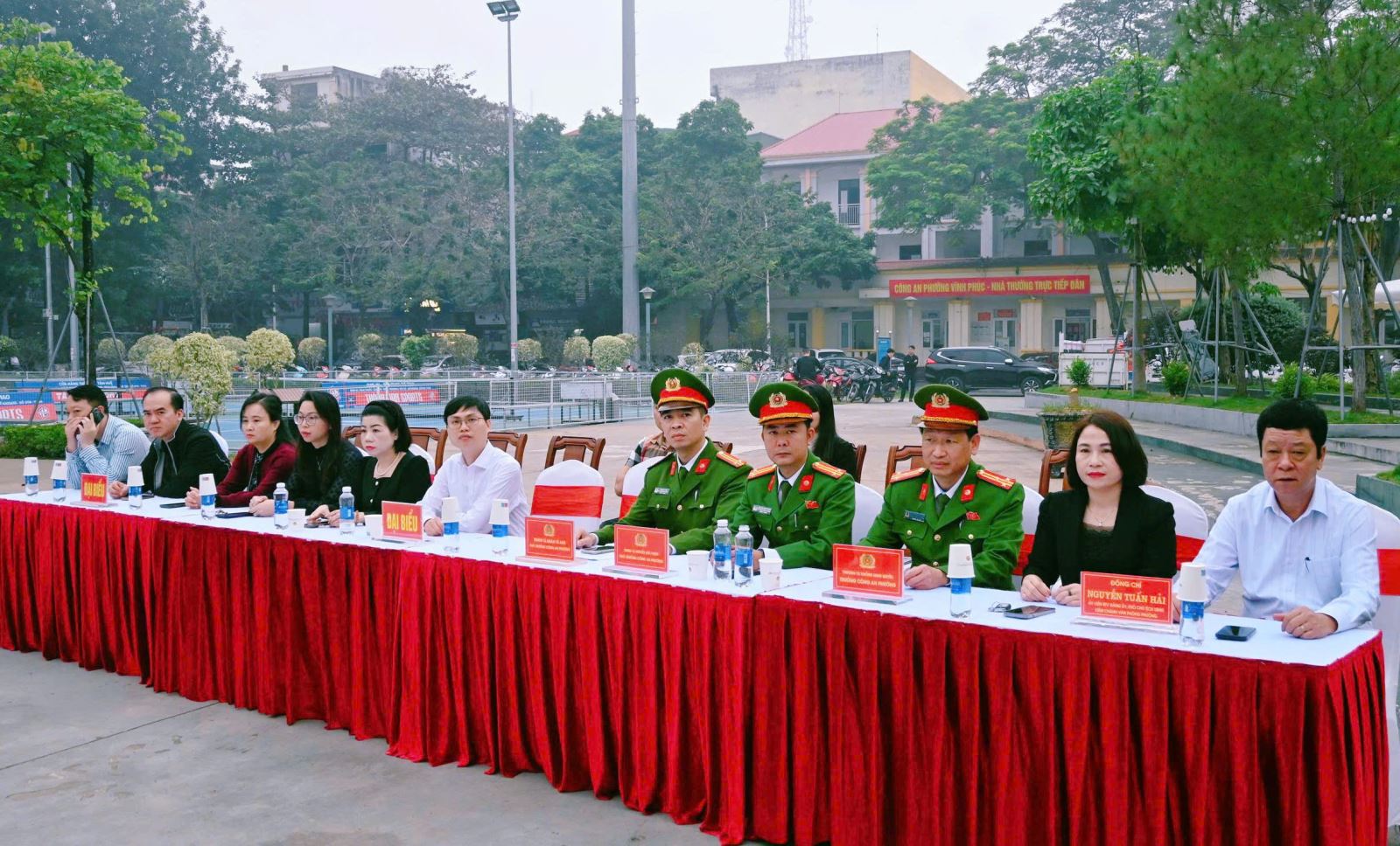 Tới dự và chỉ đạo buổi lễ có đồng chí Đại tá Nguyễn Văn Công, Phó Giám đốc Công an tỉnh. Tham dự buổi lễ còn có đồng chí Nguyễn Trung Hải - Bí thư Đảng uỷ phường Vĩnh Phúc; đồng chí Nguyễn Hoài Nam - Phó Bí thư Đảng uỷ, Chủ tịch UBND phường Vĩnh Phúc; đồng chí Nguyễn Tuấn Hải - Phó Chủ tịch UBND phường Vĩnh Yên; cùng các đồng chí lãnh đạo đại diện các ban, ngành, đoàn thể, các đồng chí cán bộ, chiến sĩ Công an phường, lực lượng an ninh trật tự cơ sở, đoàn viên, thanh niên hai phường Vĩnh Phúc và Vĩnh Yên.