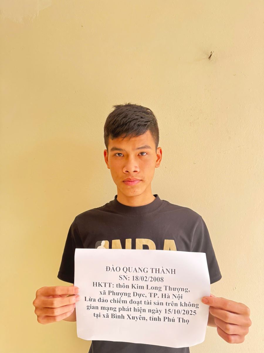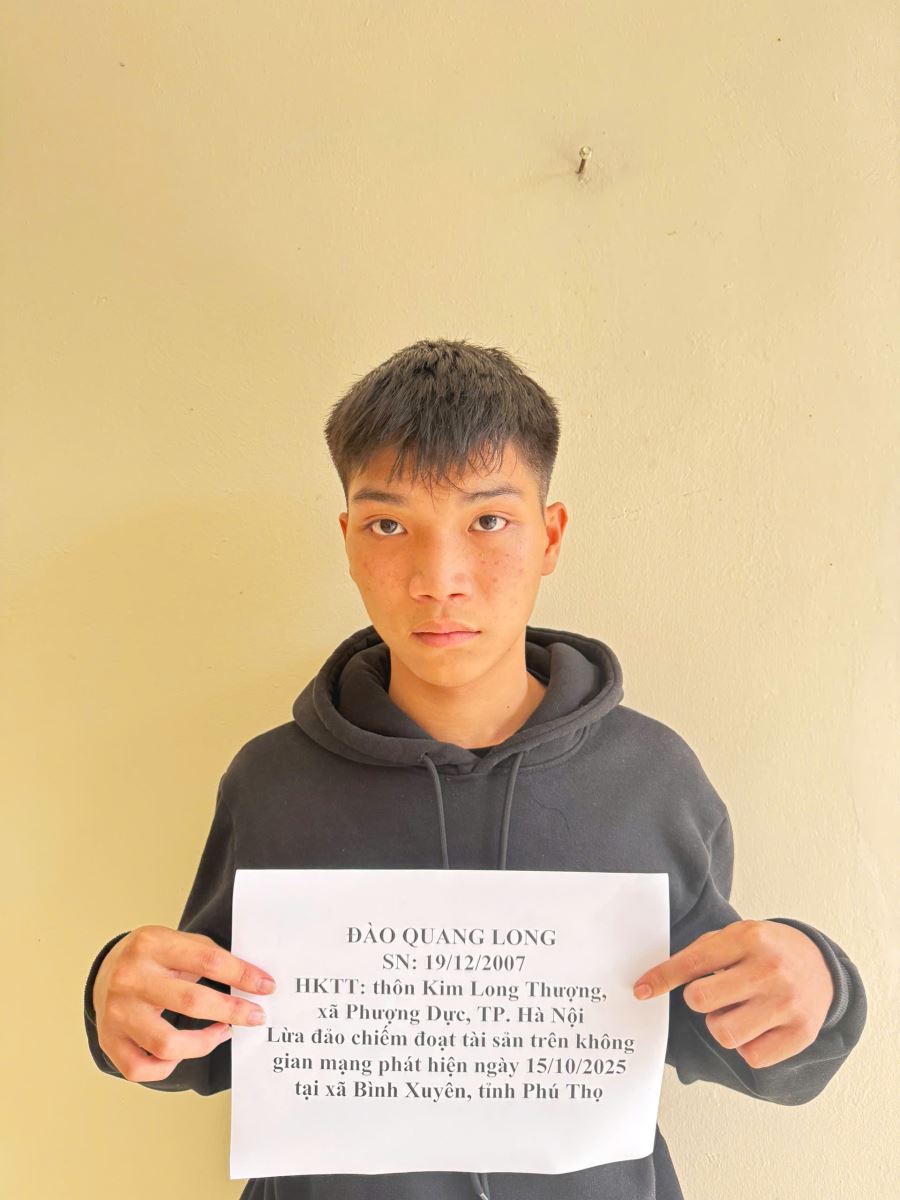 Ngày 16/12/2025, Cơ quan Cảnh sát điều tra, Công an tỉnh Phú Thọ đã ra Quyết định khởi tố vụ án, khởi tố bị can và áp dụng biện pháp ngăn chặn cấm đi khỏi nơi cư trú đối với 3 đối tượng gồm: Đào Quang Linh, sinh năm 1999; Đào Quang Thành, sinh năm 2008 (em trai ruột của Linh) và Đào Quang Long, sinh năm 2007 (em họ của Thành, Linh) cùng trú tại thôn Kim Long Phượng, xã Phượng Dực, thành phố Hà Nội về tội Lừa đảo chiếm đoạt tài sản, quy định tại khoản 1 Điều 174 Bộ luật Hình sự.
