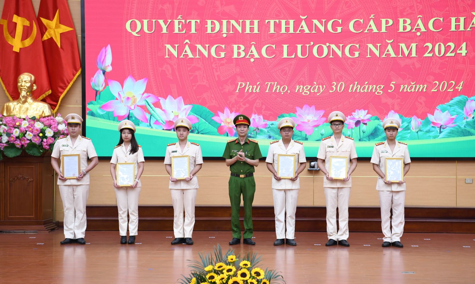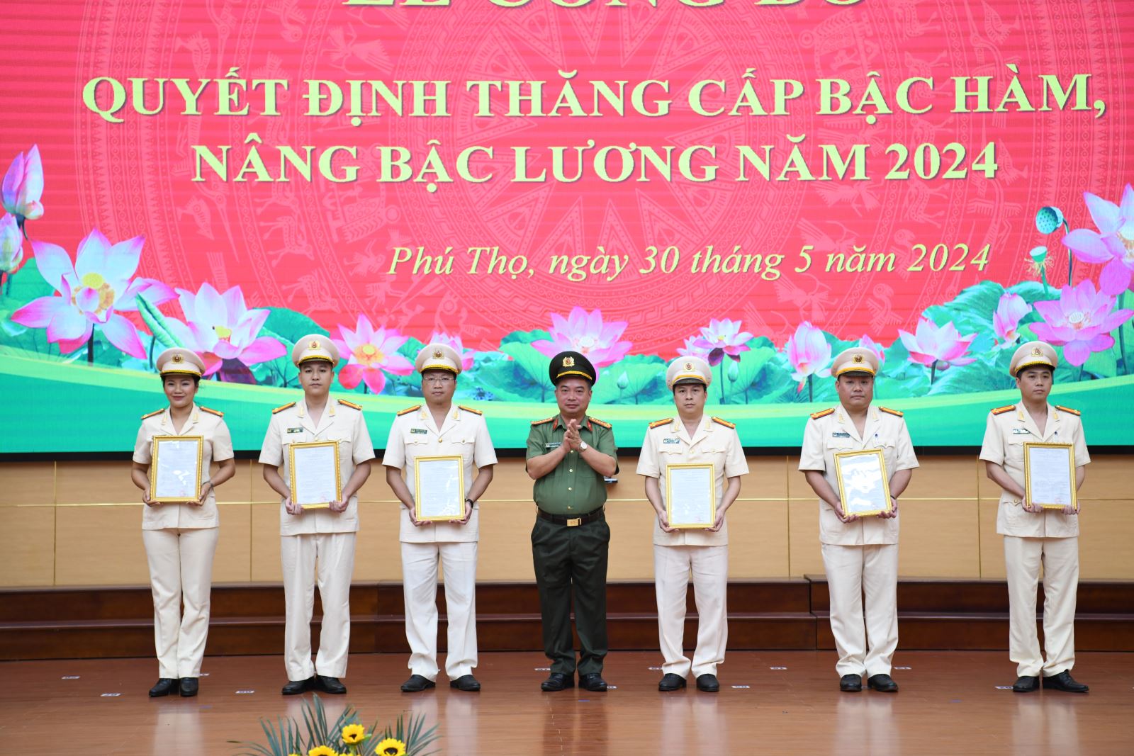Năm 2024, Công an tỉnh Phú Thọ có 891 cán bộ, chiến sỹ được ký Quyết định thăng cấp bậc hàm, nâng bậc lương, trong đó có 13 đồng chí được Bộ trưởng Bộ Công an ký Quyết định, 878 đồng chí được Giám đốc Công an tỉnh ký Quyết định.