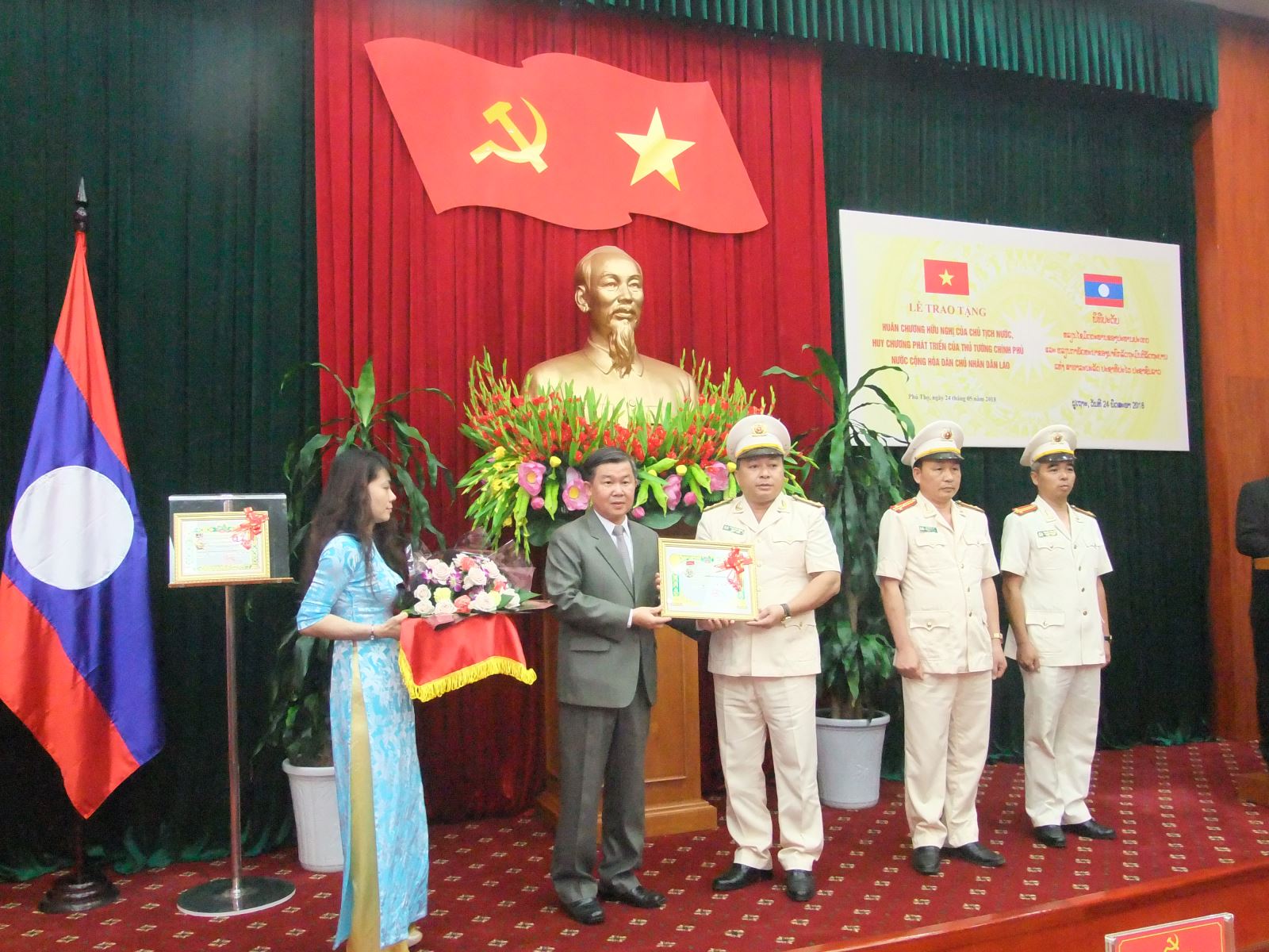 Đồng chí Phan Huy Ngọc, Phó giám đốc Công an tỉnh đón nhận huân chương hữu nghị của nước CHDCND Lào Trong không khí trang trọng, thừa ủy quyền của Chủ tịch nước, Thủ tướng Chính phủ nước CHDCND Lào, Bí thư Tỉnh ủy, Tỉnh trưởng tỉnh Luông Nậm Thà Phết-Thả-Von Phi-La-Văn đã trao Huy chương phát triển cho tỉnh Phú Thọ và Huân chương Hữu nghị cho Công an tỉnh Phú Thọ./.