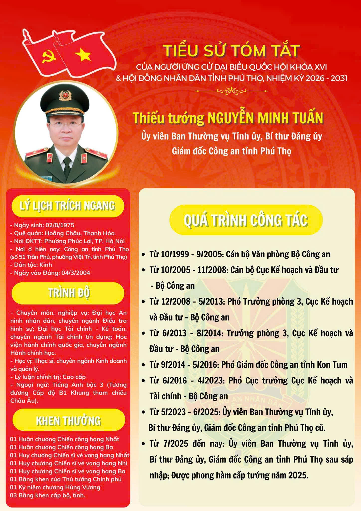 Công an tỉnh Phú Thọ trân trọng giới thiệu đồng chí Thiếu tướng Nguyễn Minh Tuấn – Uỷ viên Ban Thường vụ Tỉnh uỷ, Bí thư Đảng uỷ, Giám đốc Công an tỉnh Phú Thọ ứng cử đại biểu Quốc hội khóa XVI; đơn vị bầu cử số 2 (gồm các phường: Phong Châu, Phú Thọ, Âu Cơ và các xã: Phù Ninh, Dân Chủ, Phú Mỹ, Trạm Thản, Bình Phú, Đan Thượng, Hạ Hoà, Vĩnh Chân, Yên Kỳ, Hiền Lương, Văn Lang, Yên Lập, Thượng Long, Sơn Lương, Xuân Viên, Minh Hoà, Trung Sơn, Cẩm Khê, Phú Khê, Hùng Việt, Đồng Lương, Tiên Lương, Vân Bán, Đoan Hùng, Tây Cốc, Chân Mộng, Chí Đám, Bằng Luân, Thanh Ba, Quảng Yên, Hoàng Cương, Đông Thành, Chí Tiên, Liên Minh) và đại biểu Hội đồng nhân dân tỉnh Phú Thọ; đơn vị bầu cử số 3 (gồm các phường: Âu Cơ, Phong Châu, Phú Thọ và các xã: Thanh Ba, Quảng Yên, Hoàng Cương, Đông Thành, Chí Tiên, Liên Minh).