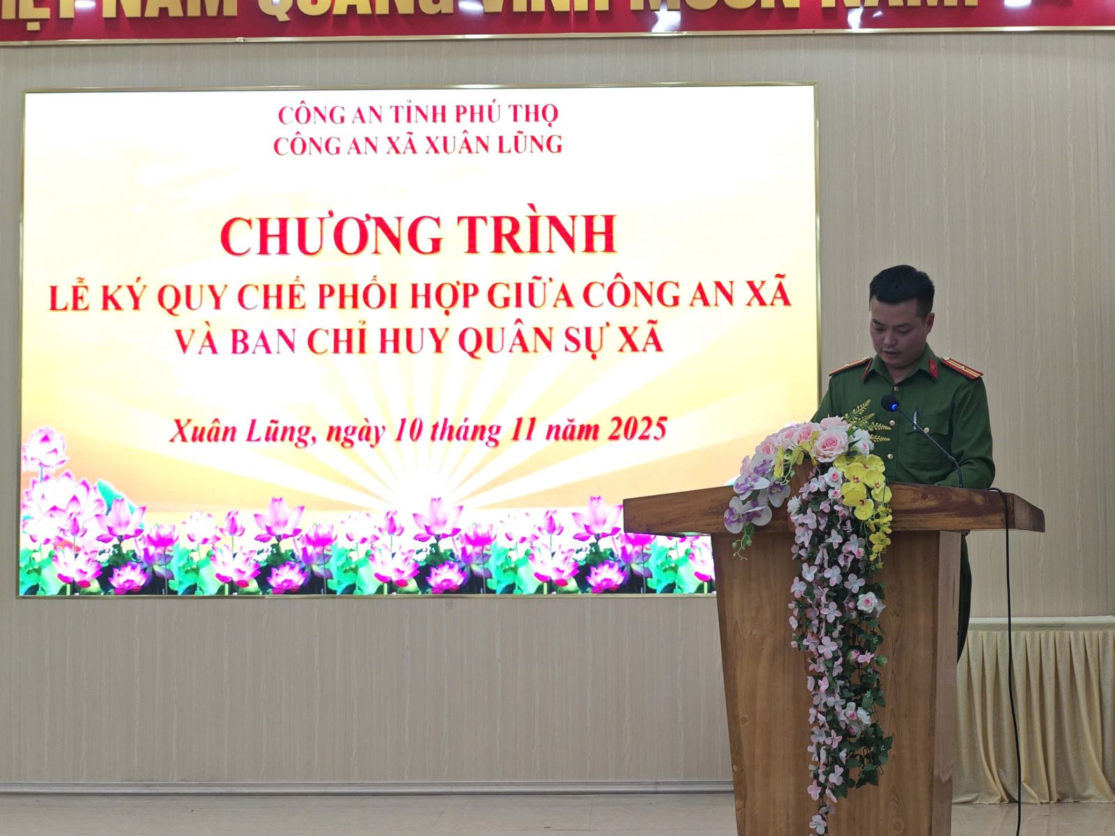 Ngày 10/11/2025, Công an xã Xuân Lũng phối hợp với Ban Chỉ huy Quân sự xã tổ chức hội nghị ký kết chương trình phối hợp trong công tác bảo đảm an ninh, trật tự, đấu tranh phòng chống tội phạm và thực hiện nhiệm vụ quốc phòng trên địa bàn. Đây là hoạt động thiết thực nhằm triển khai hiệu quả Kế hoạch số 622/KH-CAT-BCHQST ngày 25/8/2025 của Công an tỉnh Phú Thọ về phối hợp giữa lực lượng Công an và Quân sự trong công tác bảo vệ an ninh quốc gia, bảo đảm trật tự, an toàn xã hội và nhiệm vụ quốc phòng.