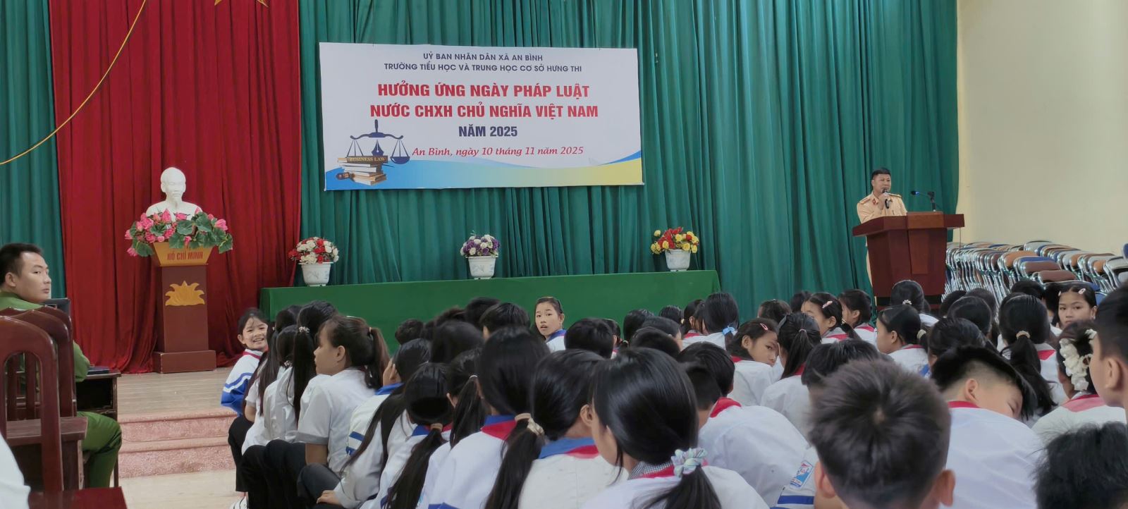 Hưởng ứng Ngày Pháp luật Việt Nam (09/11), ngày 10/11/2025, Công an xã An Bình phối hợp với Phòng Cảnh sát giao thông Công an tỉnh Phú Thọ và Trường Tiểu học&Trung học cơ sở Hưng Thi tổ chức buổi tuyên truyền pháp luật cho 331 cán bộ, giáo viên và học sinh nhà trường. Hoạt động nhằm nâng cao nhận thức, ý thức chấp hành pháp luật trong học đường, góp phần xây dựng môi trường giáo dục an toàn, lành mạnh.
