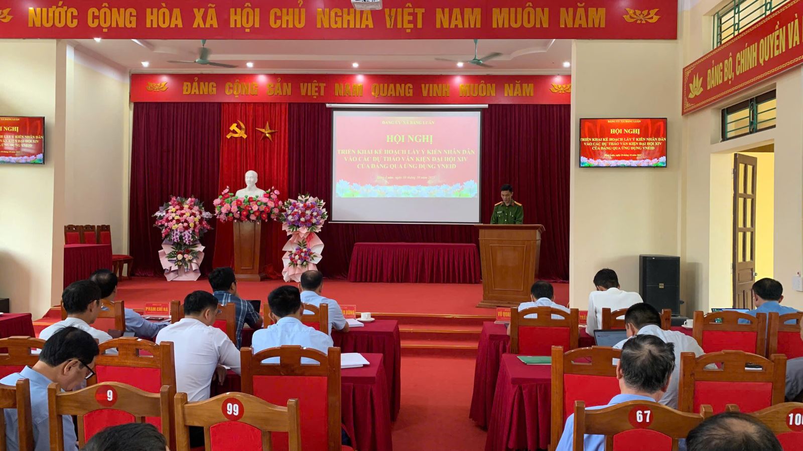 Tại hội nghị, Công an xã đã quán triệt, triển khai nội dung kế hoạch của Công an tỉnh và văn bản chỉ đạo thực hiện của Đảng uỷ xã; tuyên truyền đến cán bộ, đảng viên về chủ trương, tiện ích của việc lấy ý kiến đối với các dự thảo văn kiện Đại hội XIV của Đảng qua ứng dụng VNeID, để tạo sự đồng thuận và tích cực tham gia. Đồng thời, hướng dẫn các chi, Đảng bộ đóng góp ý kiến vào các dự thảo văn kiện Đại hội lần thứ XIV của Đảng qua ứng dụng VNeID một cách sinh động qua video trình chiếu trên màn hình.