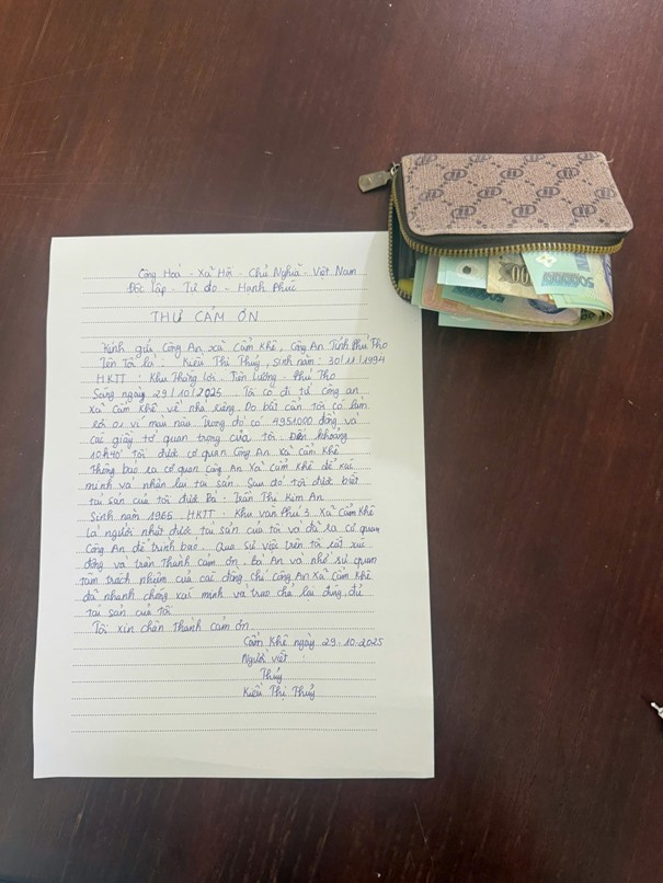 Theo trình báo của bà Trần Thị Kim An, sinh năm 1956, trú tại khu Văn Phú 3, xã Cẩm Khê, trong khi tham gia giao thông, bà có nhặt được một chiếc ví da màu nâu, bên trong có 4.951.000 đồng cùng một số giấy tờ tùy thân quan trọng. Sau khi phát hiện, bà An đã chủ động đến Công an xã Cẩm Khê để trình báo và giao nộp lại tài sản.