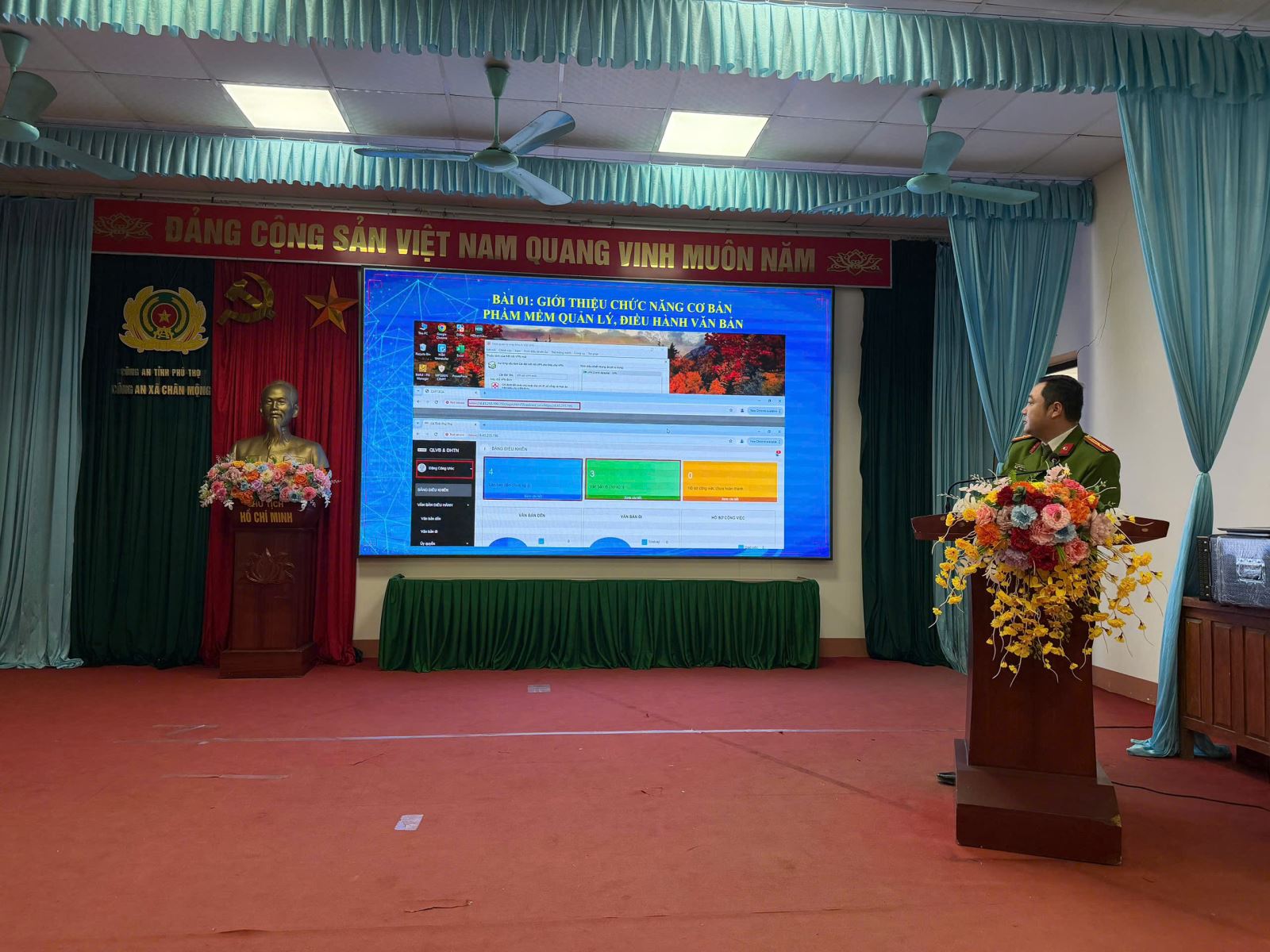 Một trong những điểm nhấn nổi bật là việc chủ động đầu tư cơ sở hạ tầng phục vụ công tác tuyên truyền và điều hành. Đơn vị đã triển khai lắp đặt hệ thống màn hình Led 200 inch, phục vụ hiệu quả cho việc tuyên truyền chủ trương, chính sách của Đảng, pháp luật của Nhà nước; phổ biến kiến thức về an ninh trật tự, phòng chống tội phạm, cũng như thông tin cảnh báo, hướng dẫn người dân thực hiện các dịch vụ công trực tuyến. Hệ thống này không chỉ giúp nâng cao hiệu quả truyền thông mà còn tạo điều kiện để ứng dụng các giải pháp công nghệ trong công tác quản lý và điều hành.