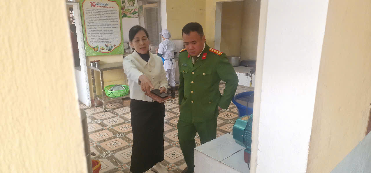 Công an xã Cự Đồng kiểm tra vệ sinh an toàn thực phẩm tại Trường Mầm non Cự Đồng, xã Cự Đồng.